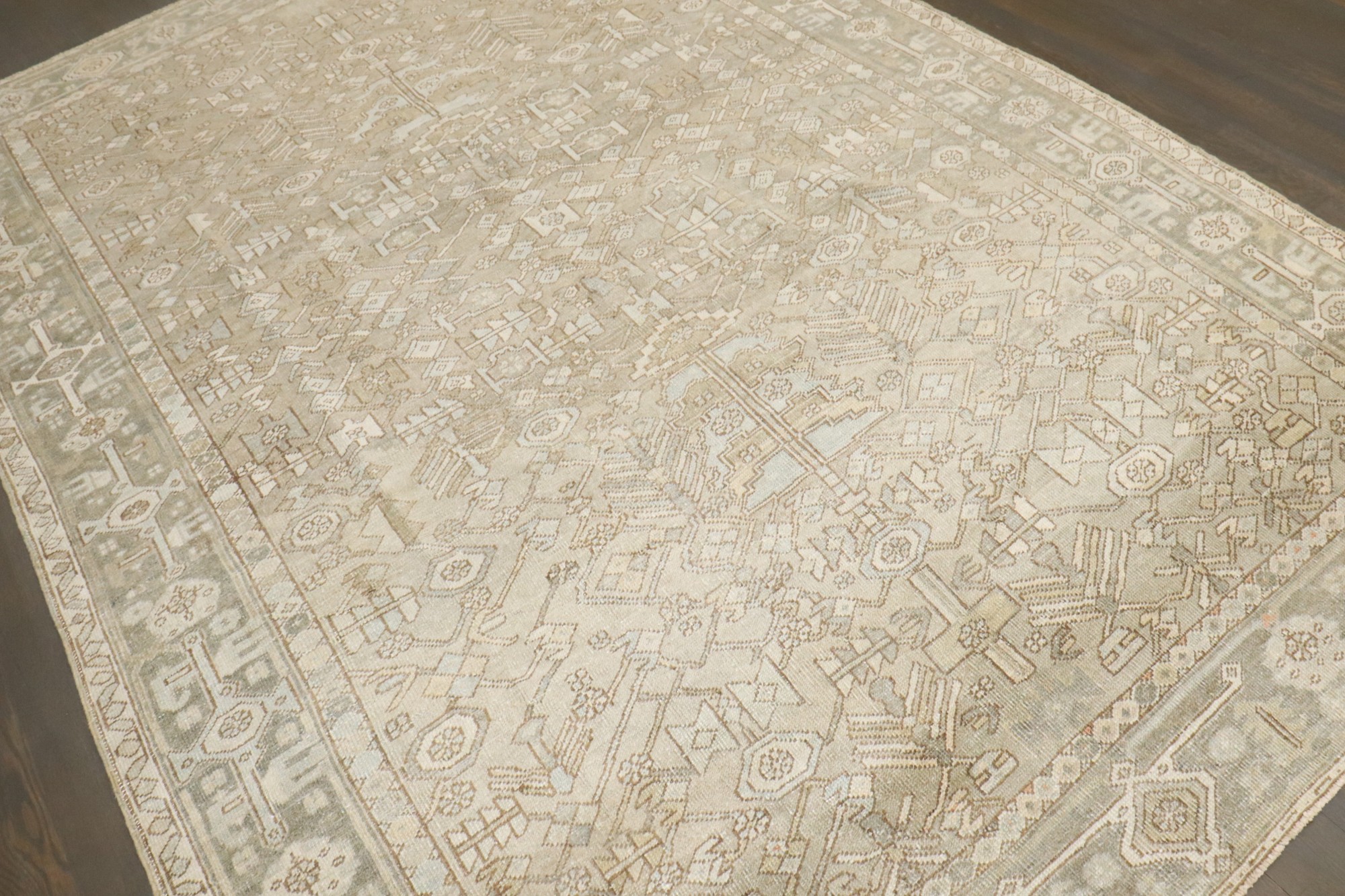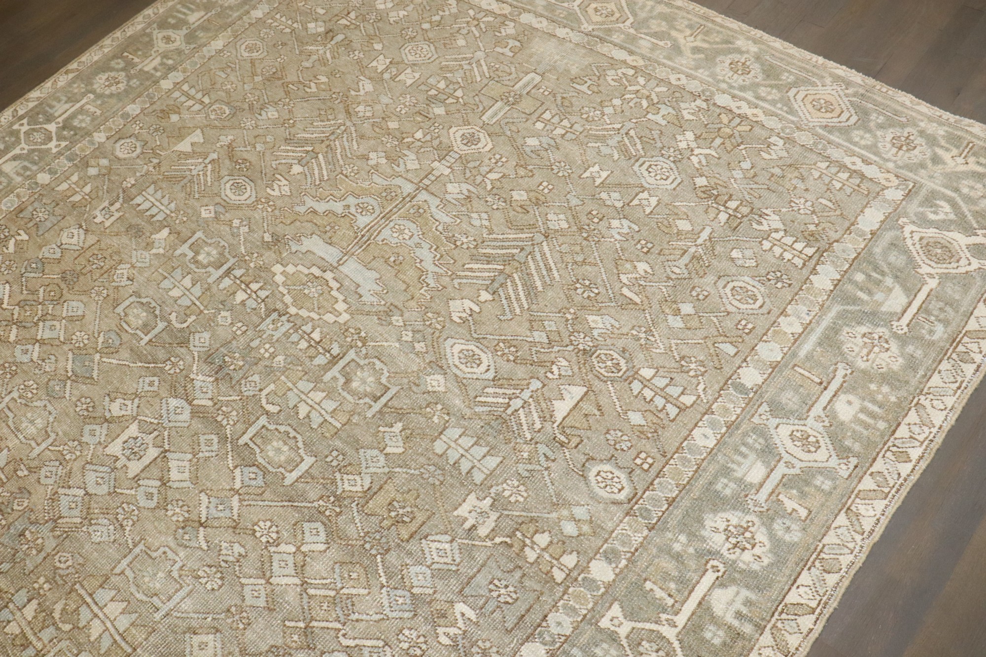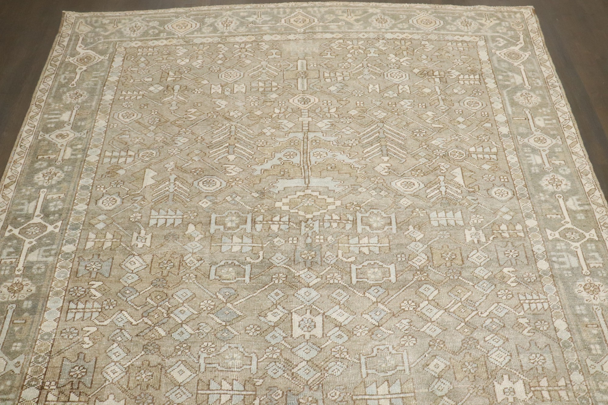 a small room size Persian Heriz Rug in predominantly taupe, accent colors in soft blues and greens