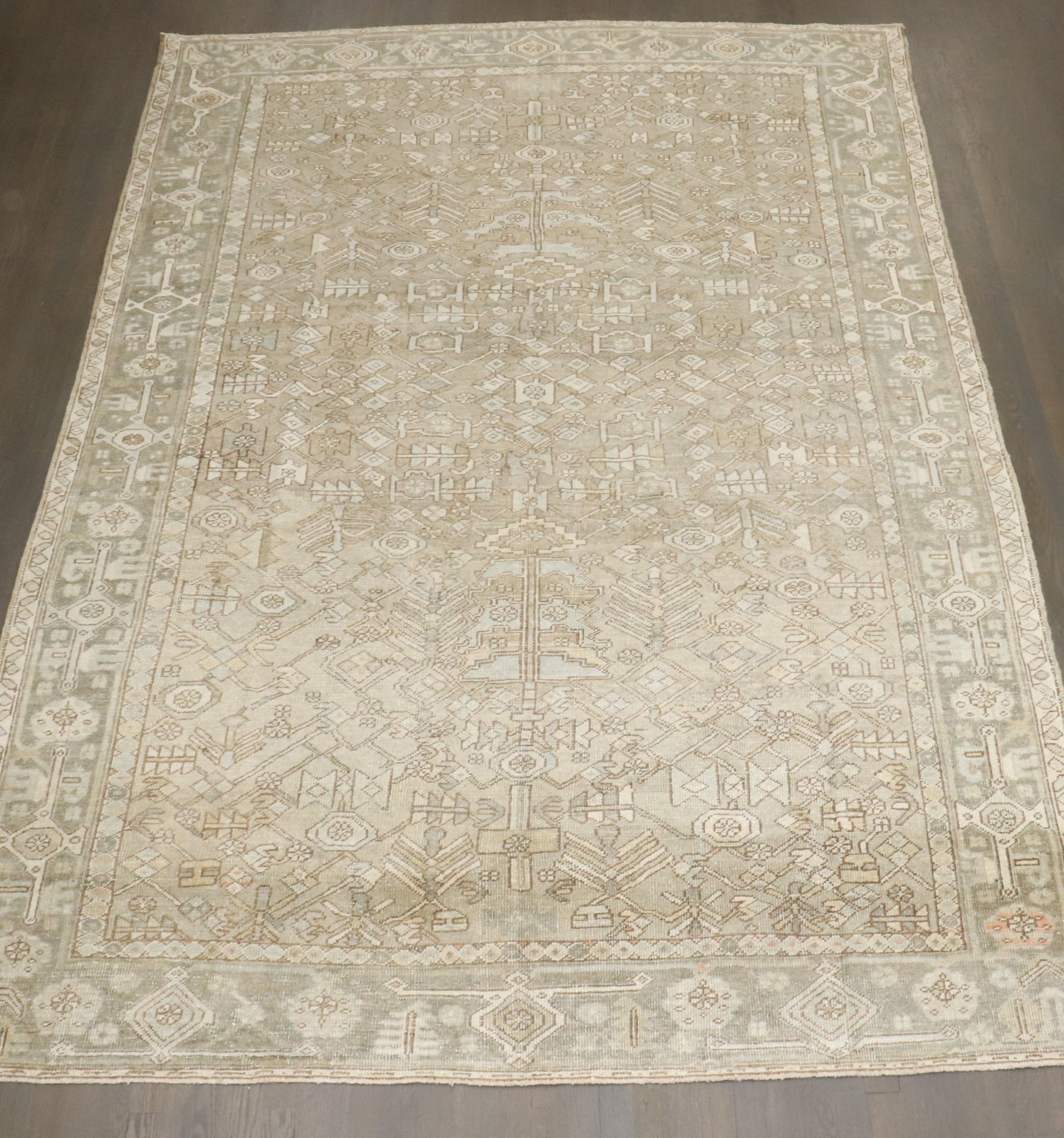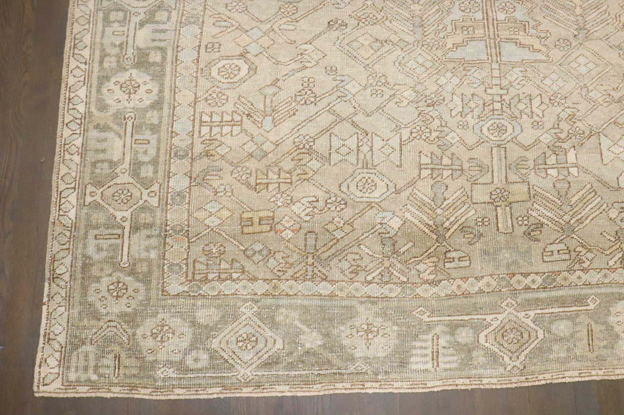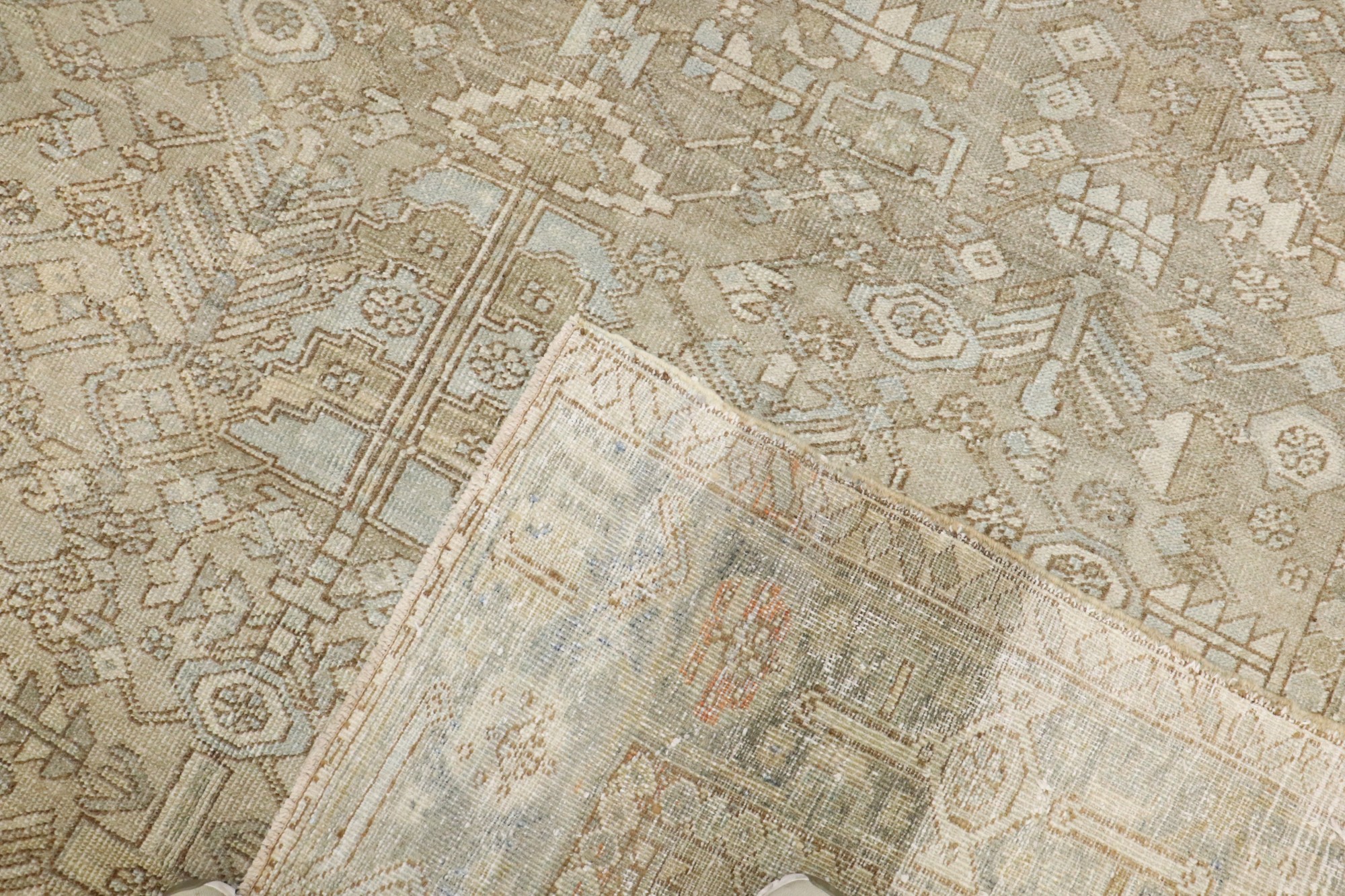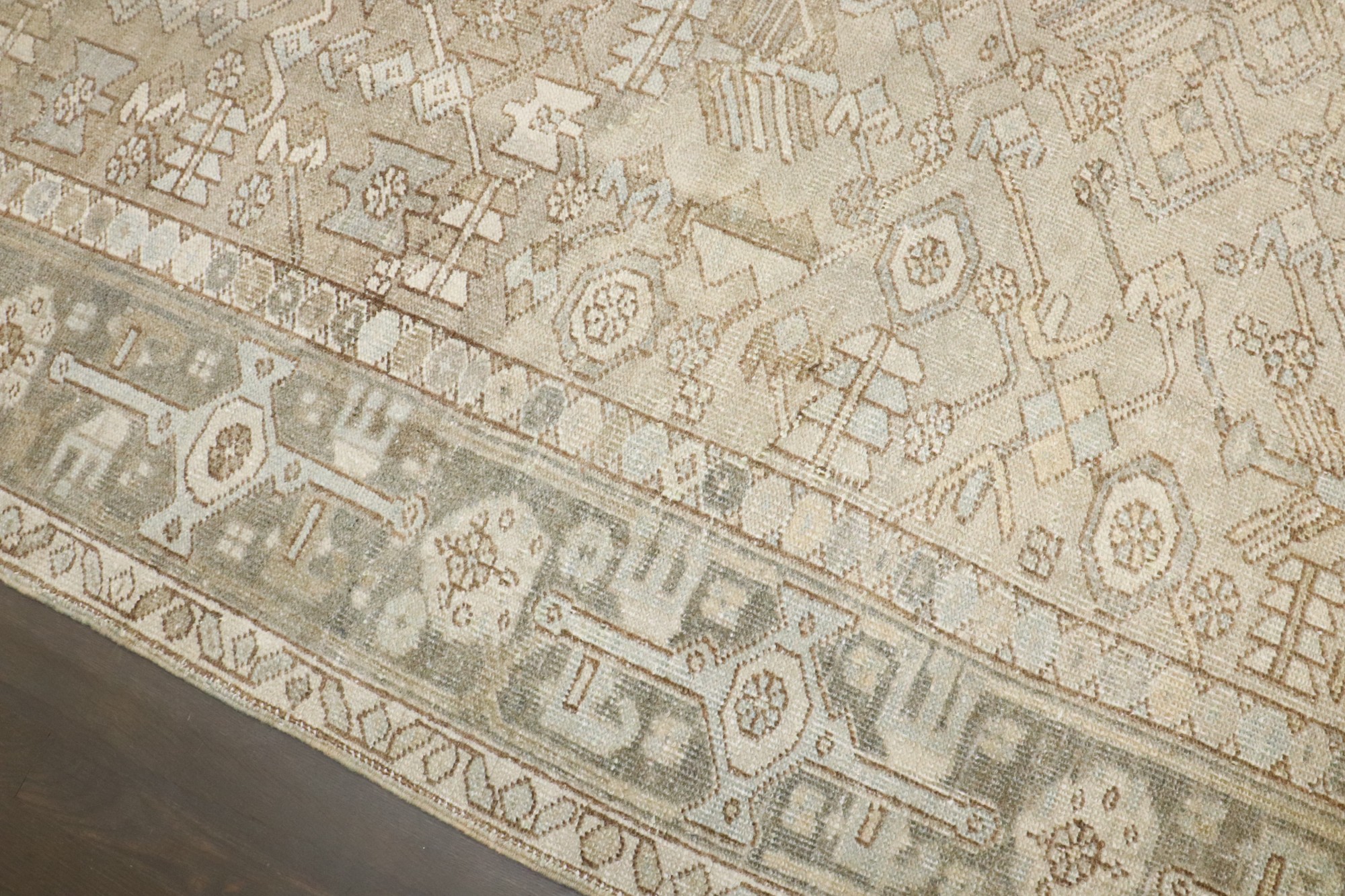 a small room size Persian Heriz Rug in predominantly taupe, accent colors in soft blues and greens