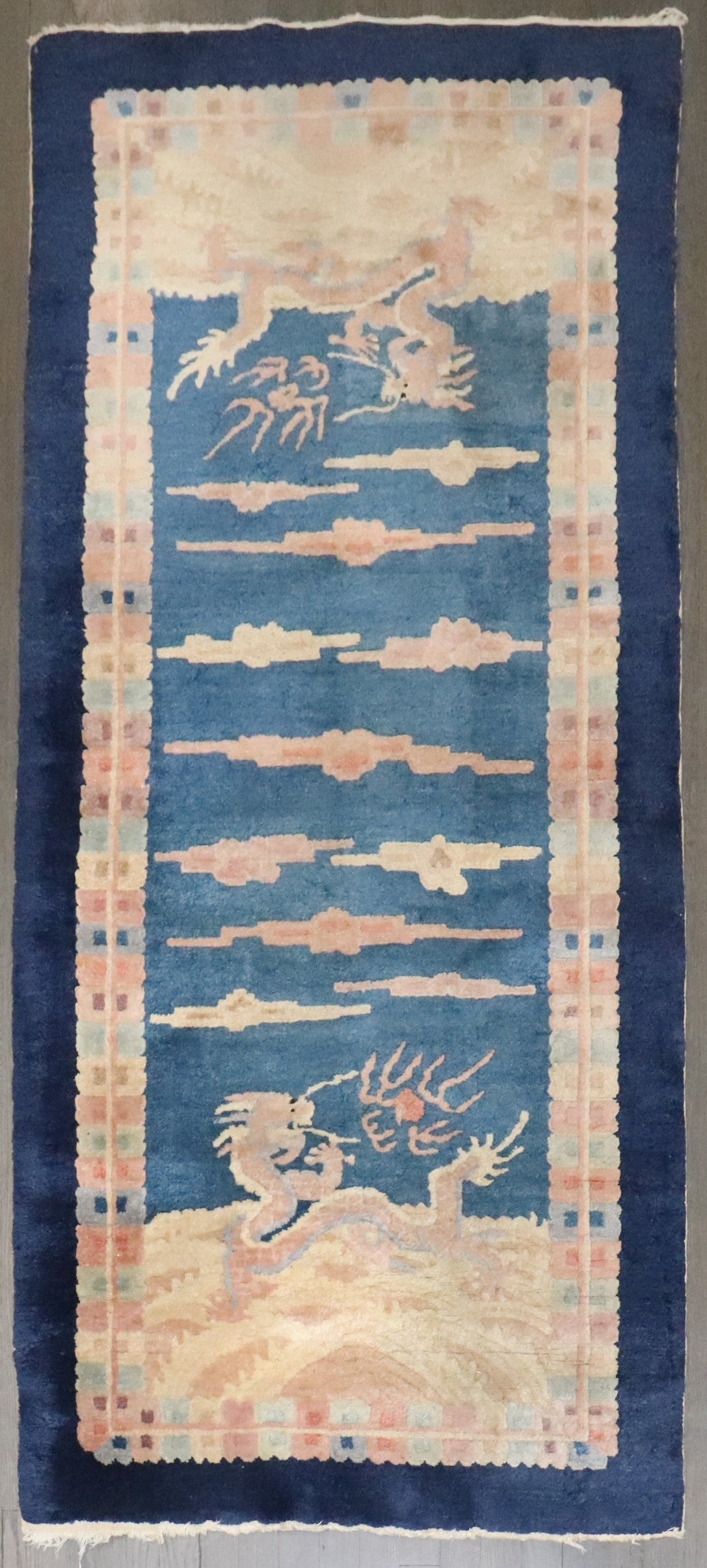 an early 20th century small chinese runner with a dragon design in blue and tan