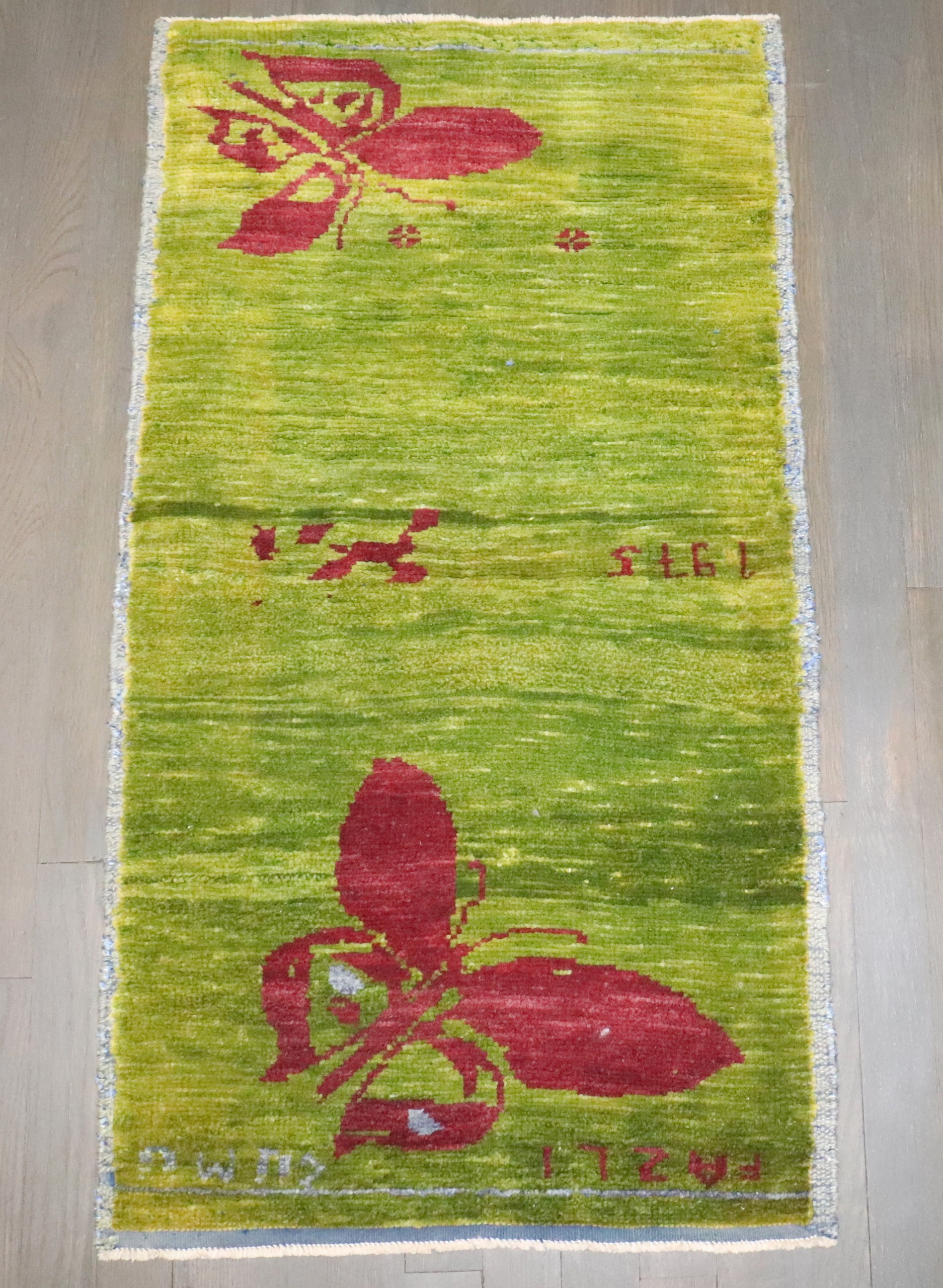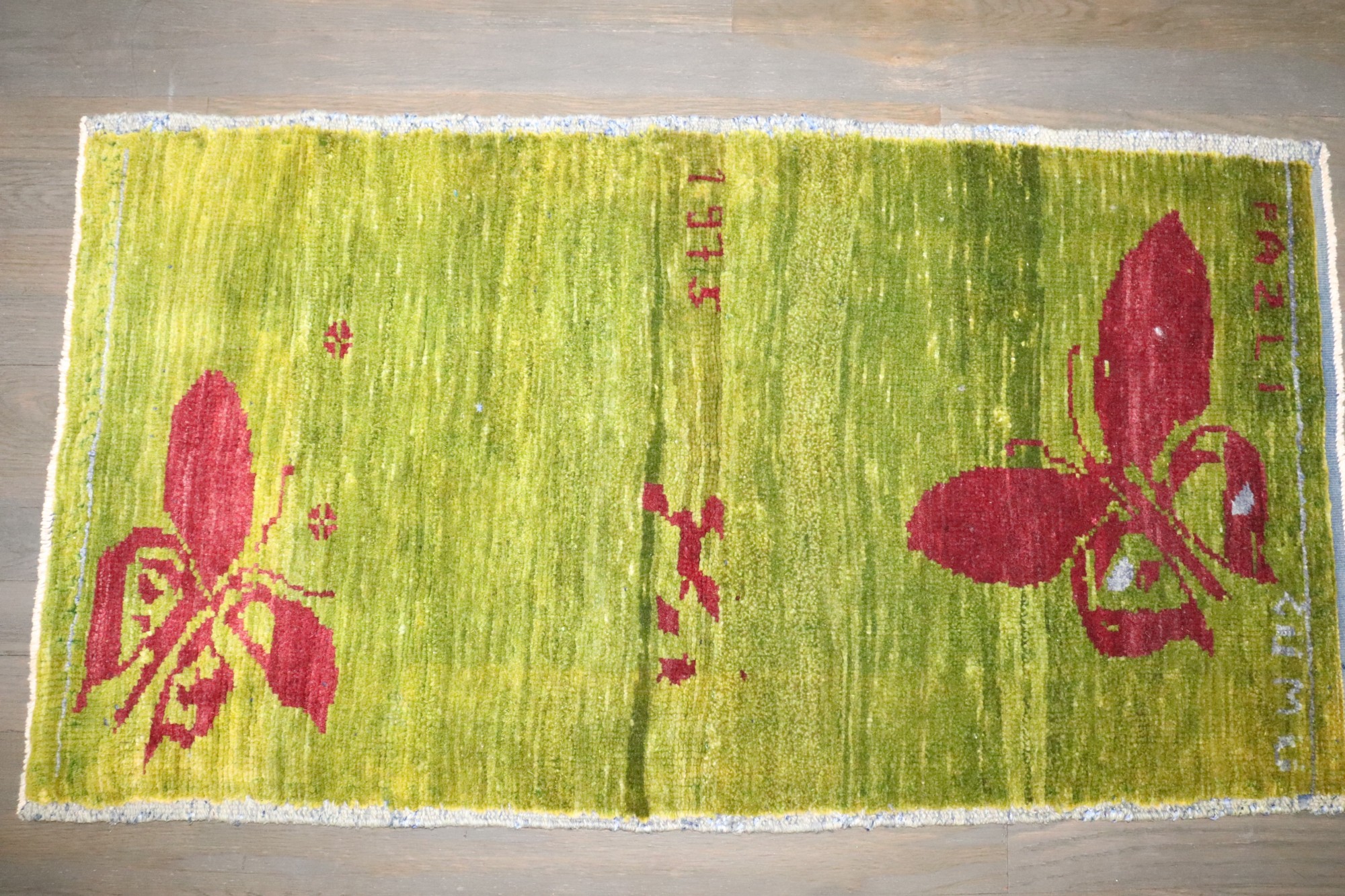 a Turkish Anatolian green color rug with a butterfly design dated 1975