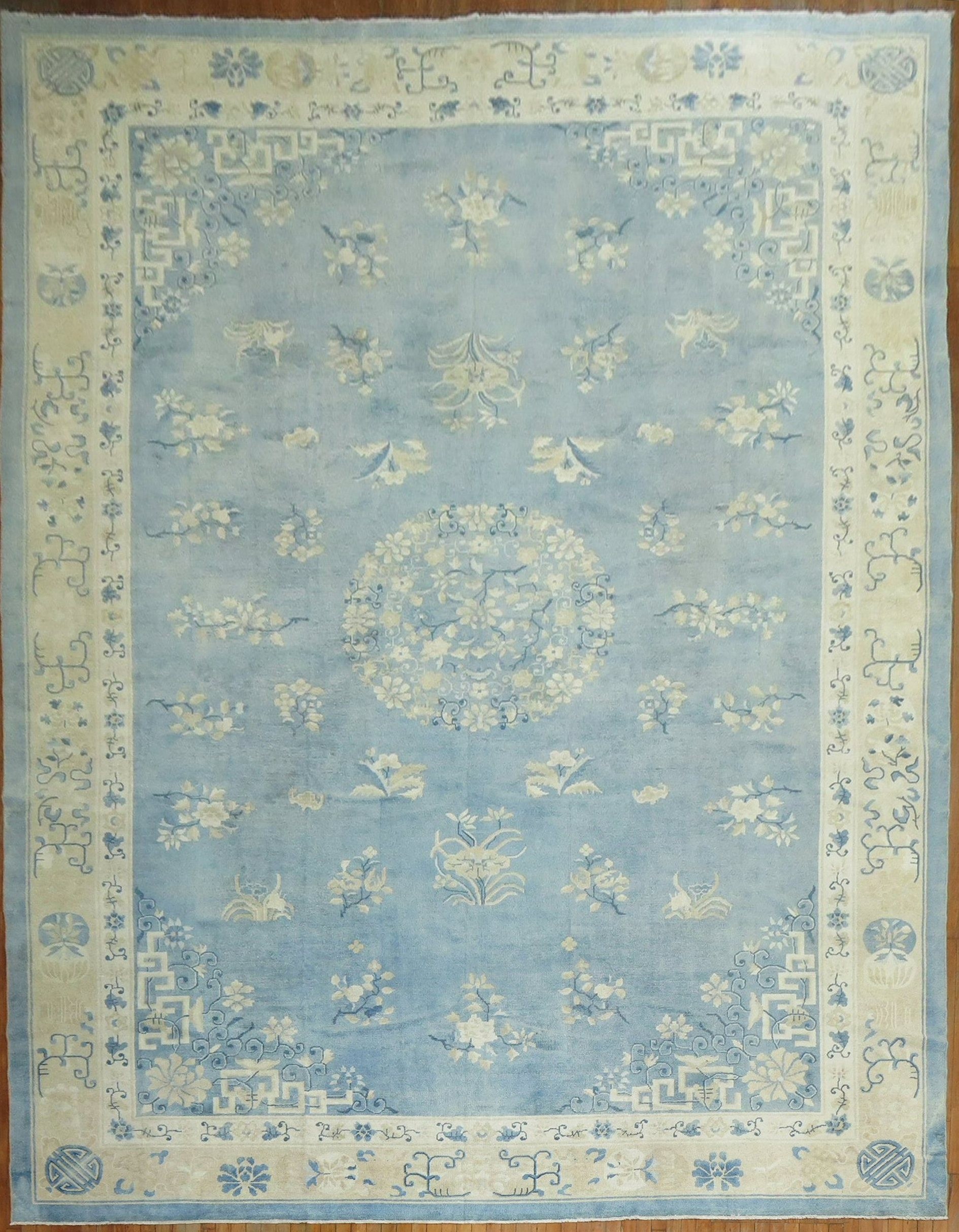 An early 20th century oversize size one of a kind Chinese rug in various predominant light blues and creams. The wool and feel of the rug is very soft on the feet. It has a silky sheen to it as well. Wool on cotton foundation.