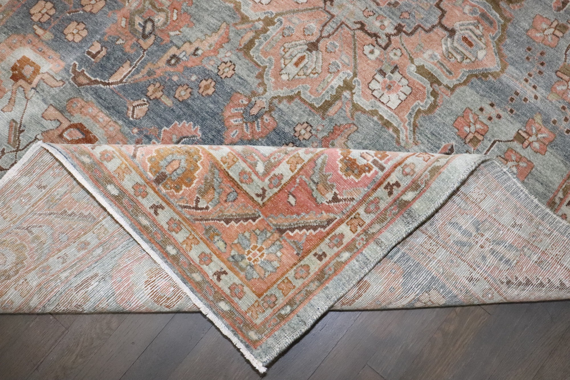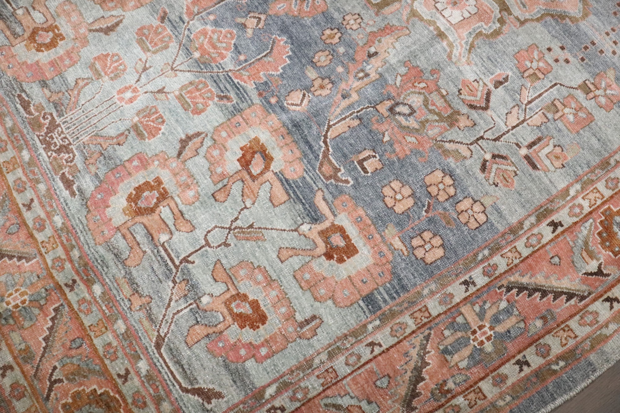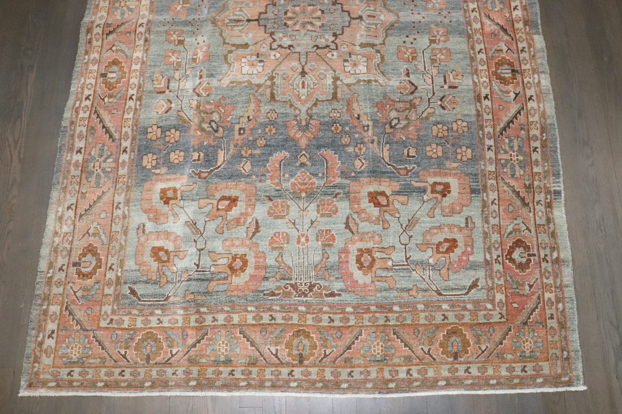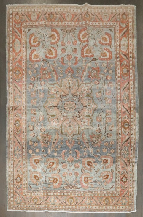 an antique 1920s Persian Sarouk Rug with salmon and terracotta accent blue gray field rug