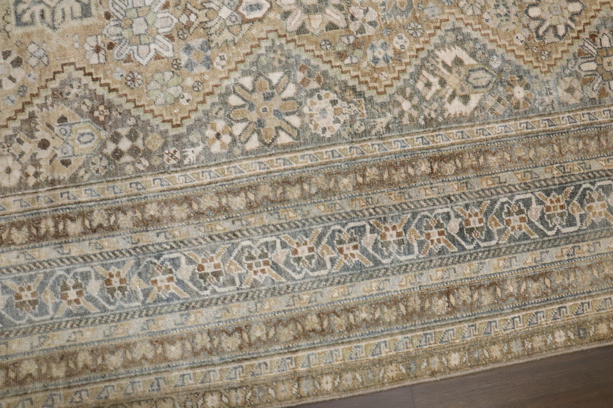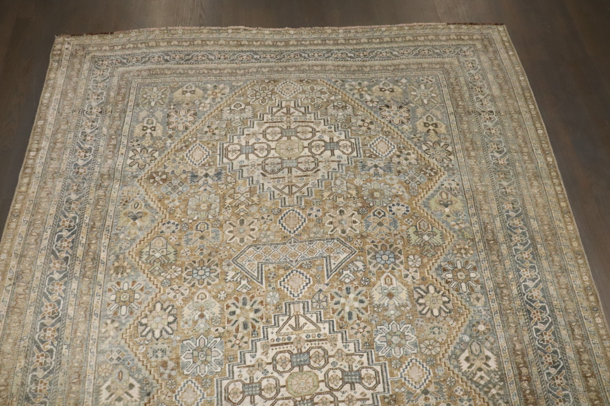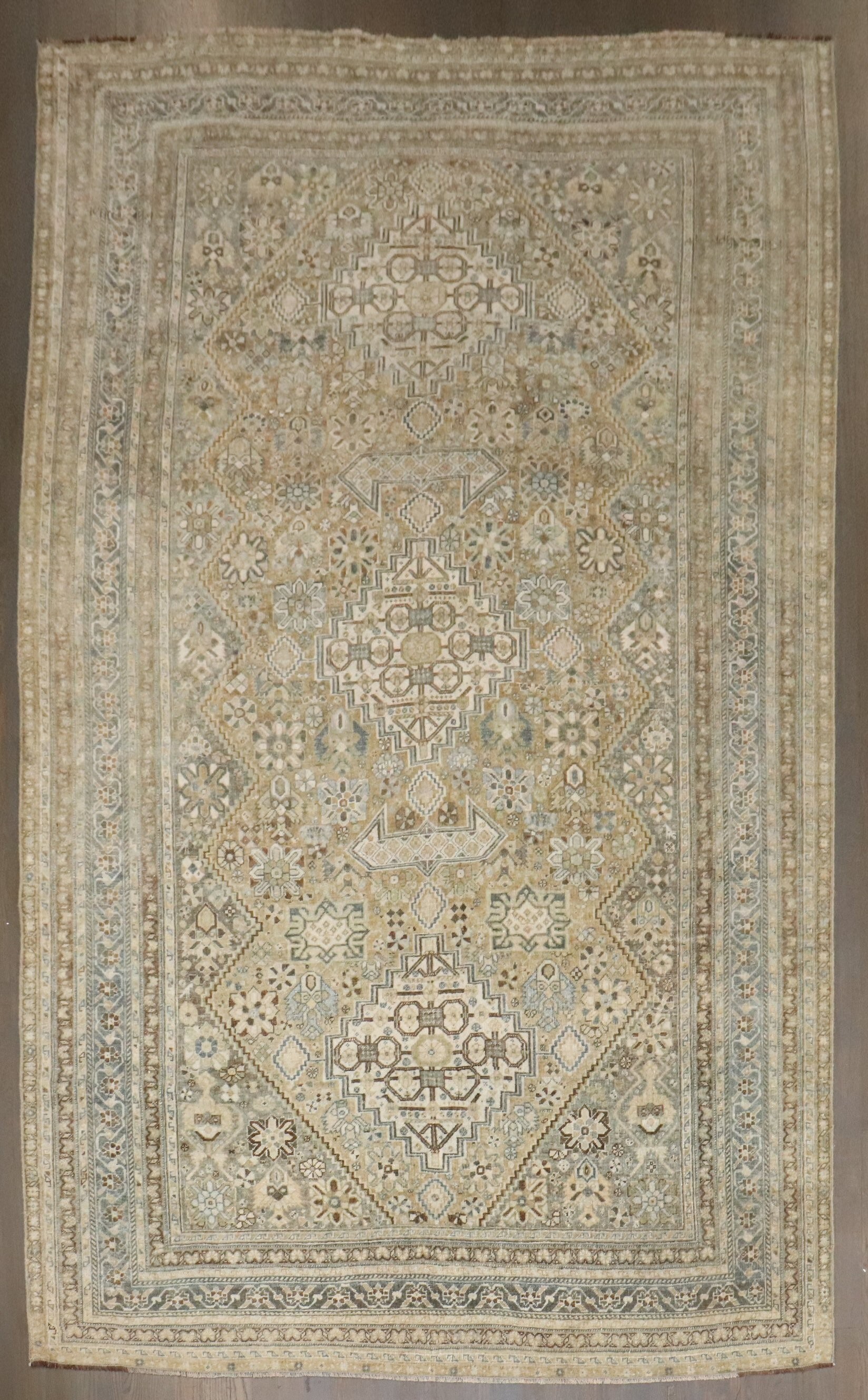 a tribal persian shiraz rug in cool earth tones from the 2nd quarter of the 20th century