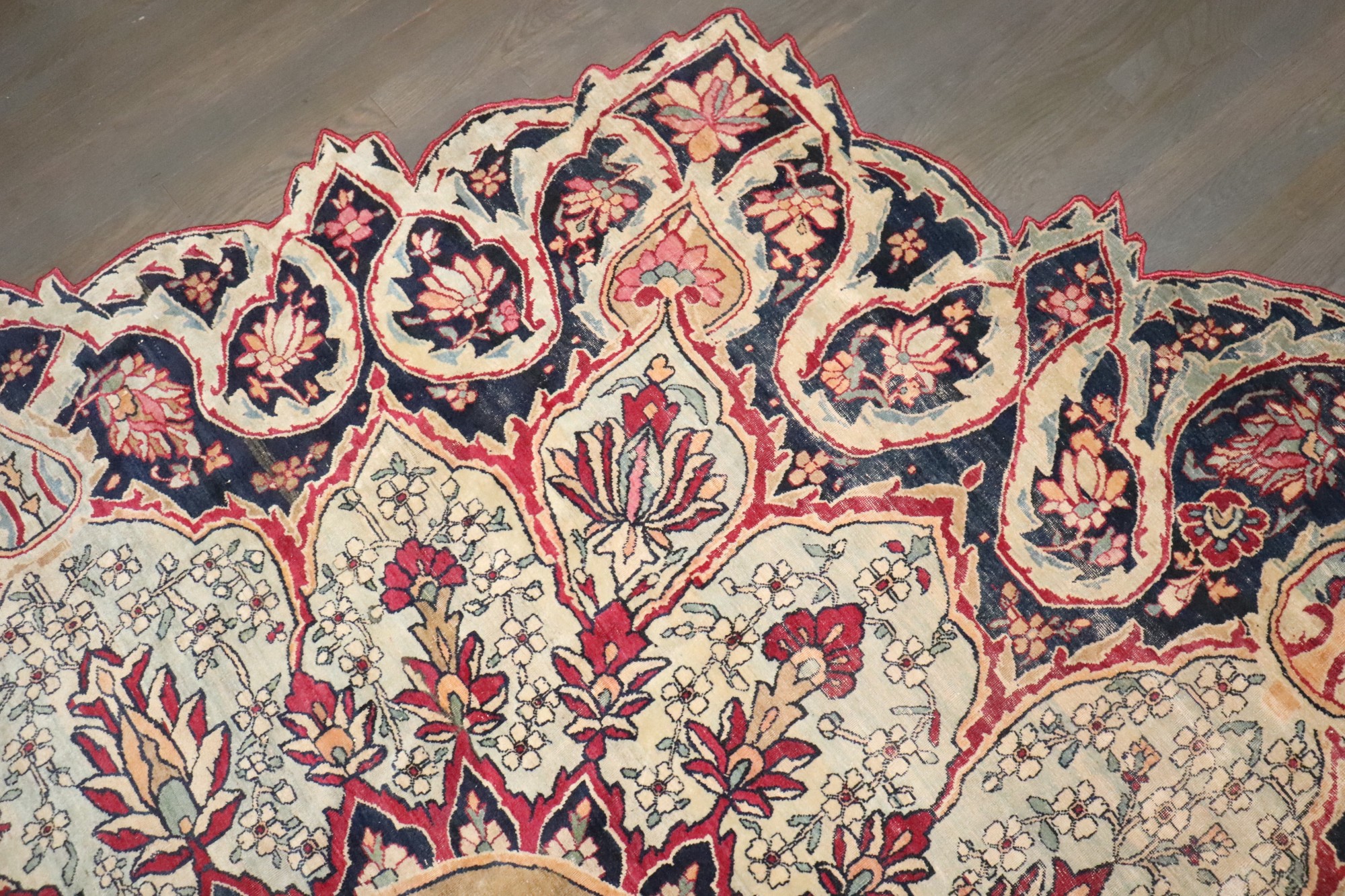 This exceptional Persian Tabriz rug features a rare and highly sought-after scalloped medallion silhouette, showcasing the masterful curvilinear artistry for which Tabriz is celebrated. Hand-knotted in Iran during the late 19th century, the rug displays an intricate arrangement of floral palmettes, scrolling vines, and layered petals, all radiating from an ornate circular central medallion. The palette blends soft ivory, warm gold, deep navy, and rich burgundy, creating a sophisticated yet inviting aesthetic. The unusually shaped border—composed of repeating lobed motifs—elevates this rug from traditional to sculptural, making it a true statement piece suitable for refined interiors. Crafted from high-quality wool on a cotton foundation, the rug retains a supple handle and beautifully aged character. Its organic outline allows it to function not only as a floor covering but as decorative art within a room.