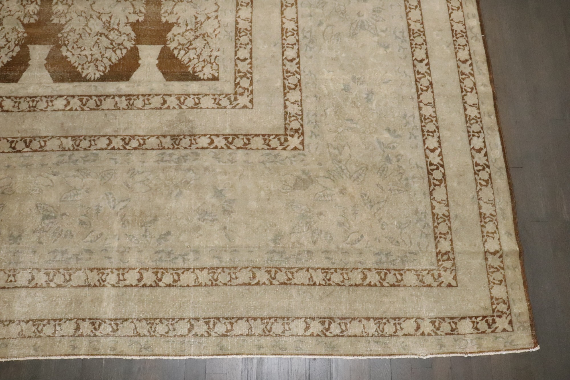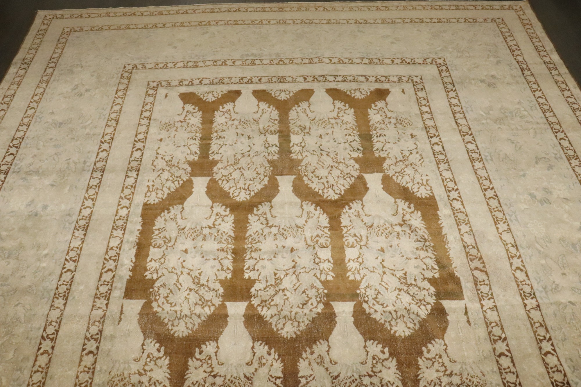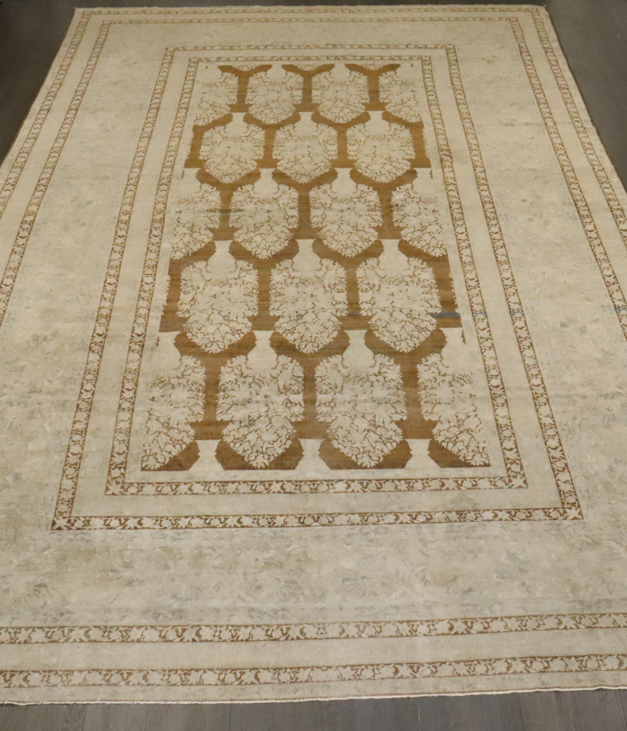 an early 20th Century Indian Larestan Rug with an all-over large scale plant vase pattern on a brown field