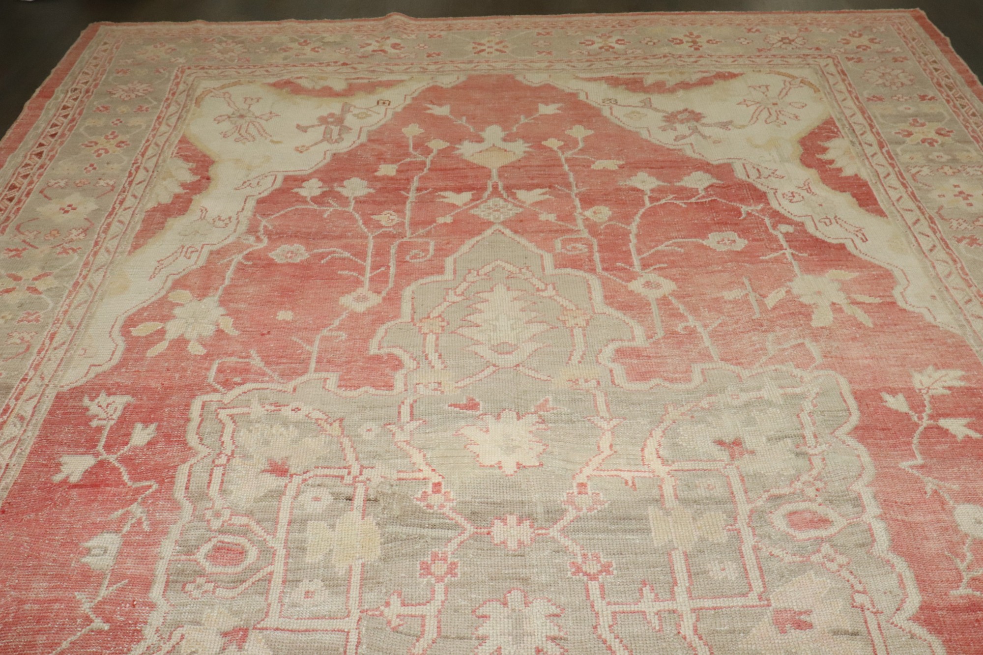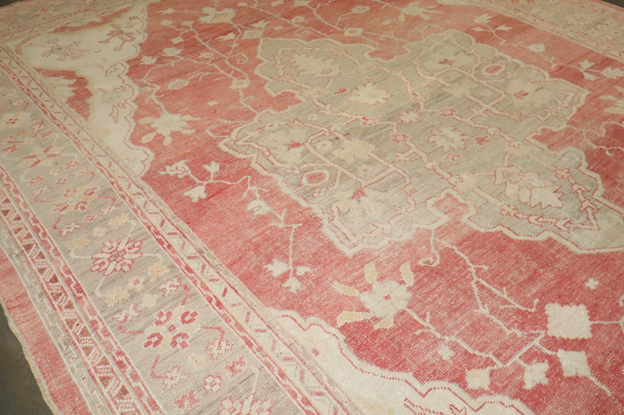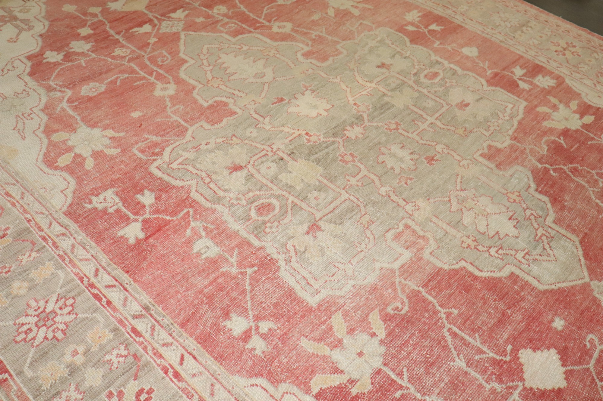an early 20th century antique turkish oushak carpet in soft reds and creams