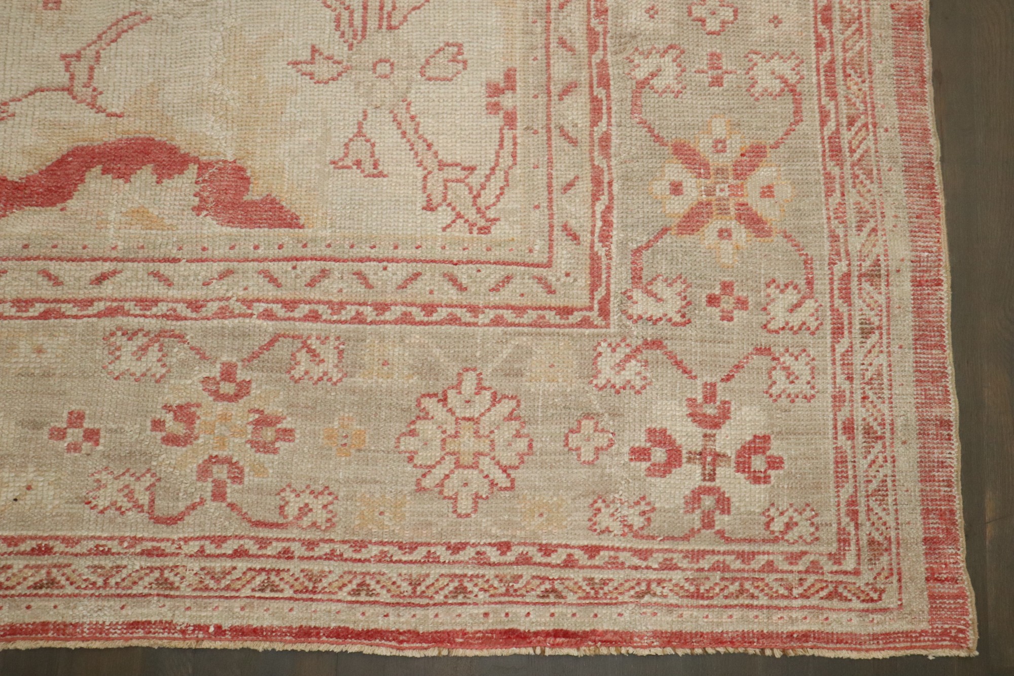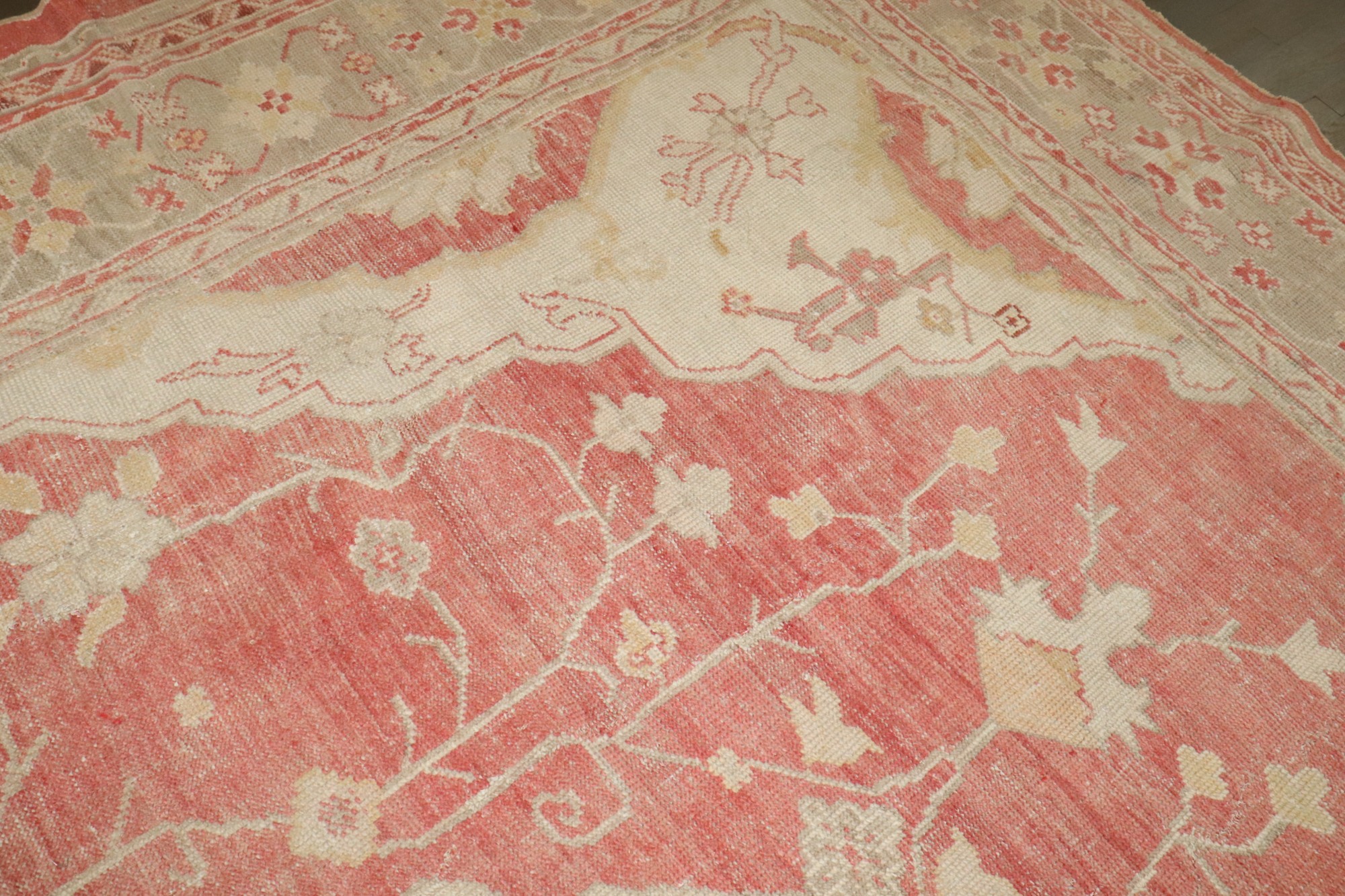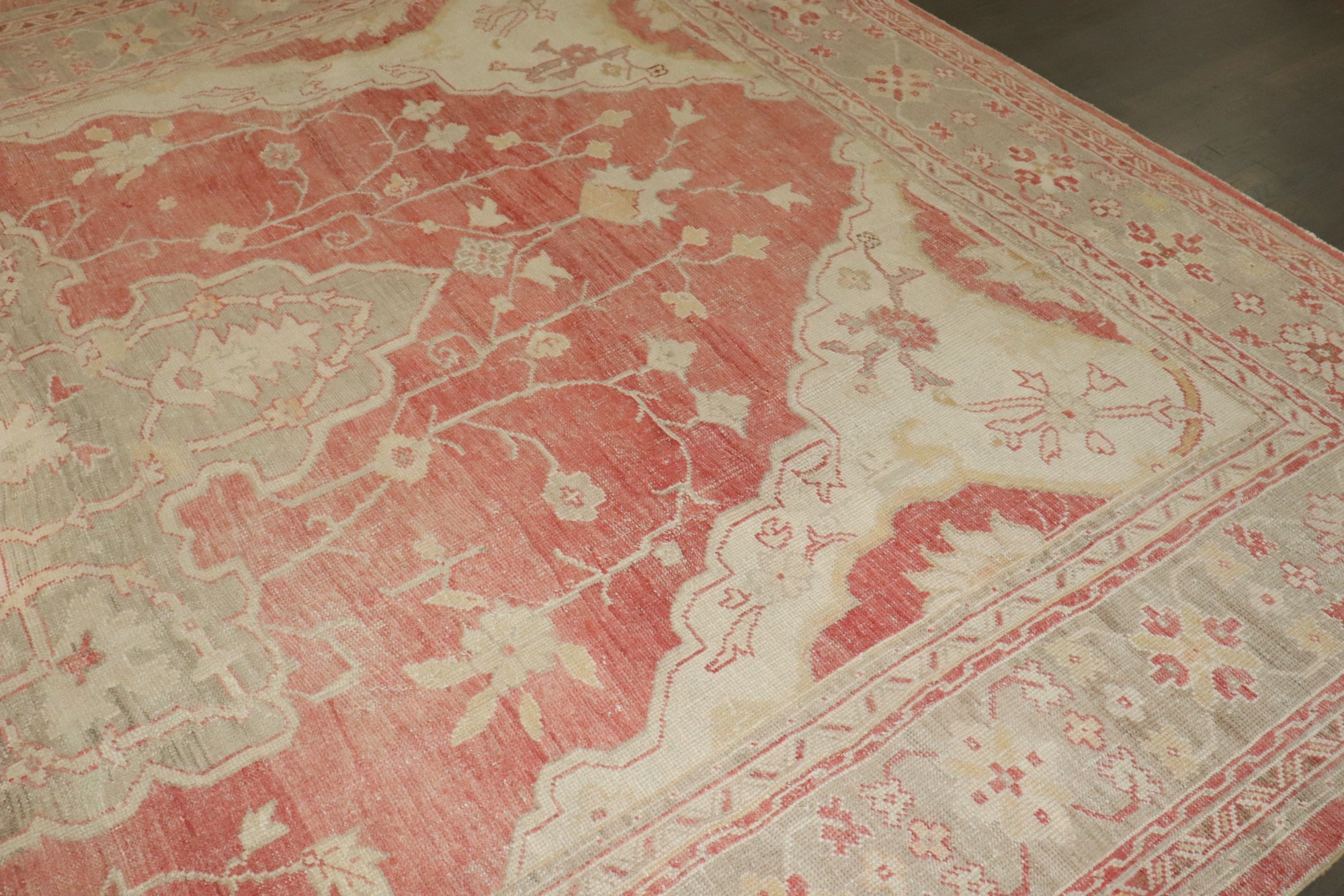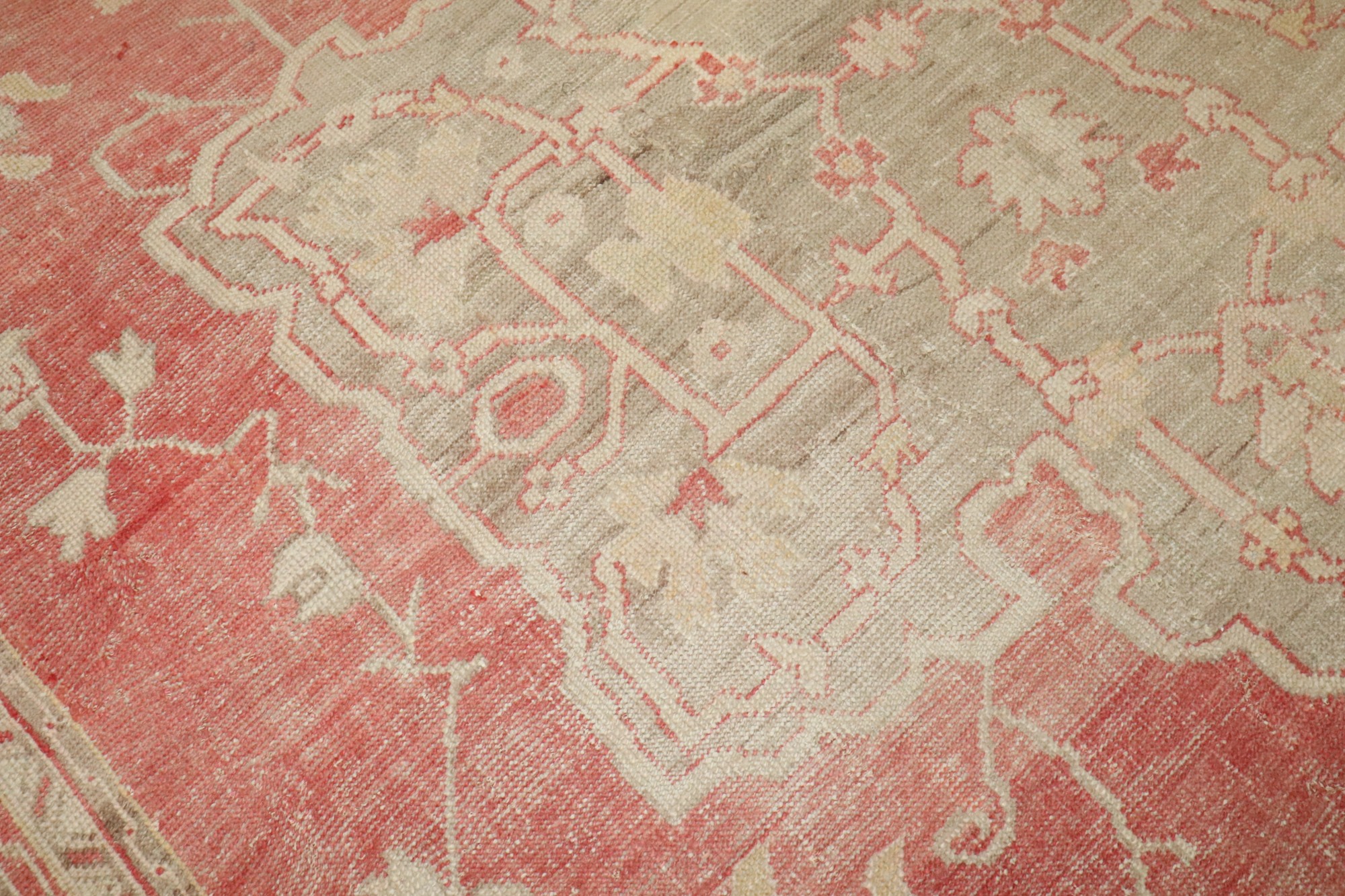an early 20th century antique turkish oushak carpet in soft reds and creams