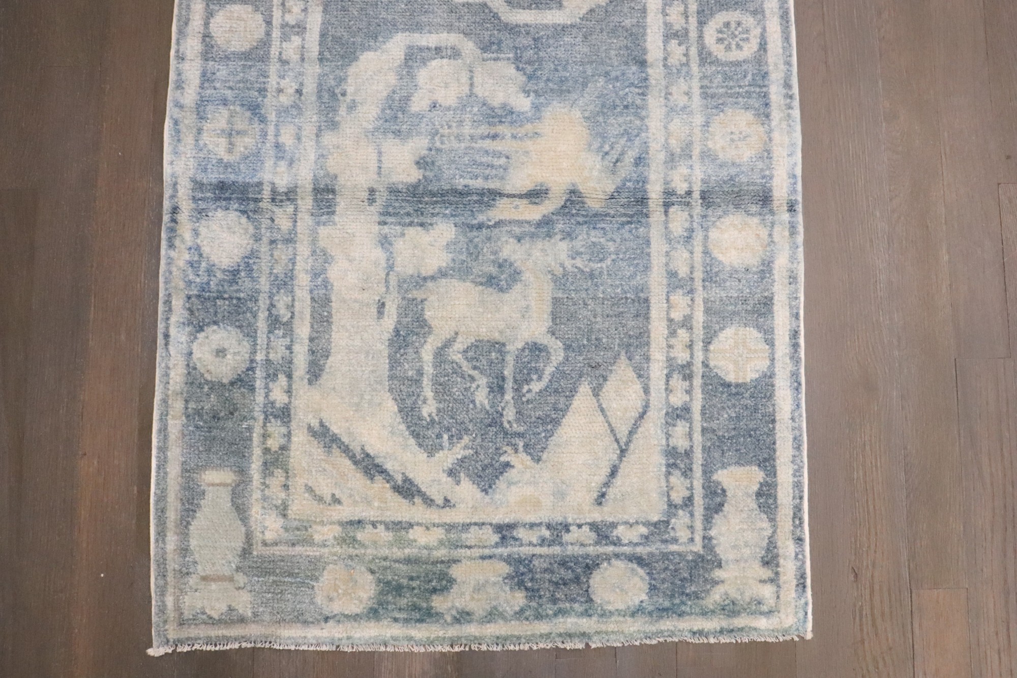 a small chinese pictorial rug with 2 reindeers on a blue field