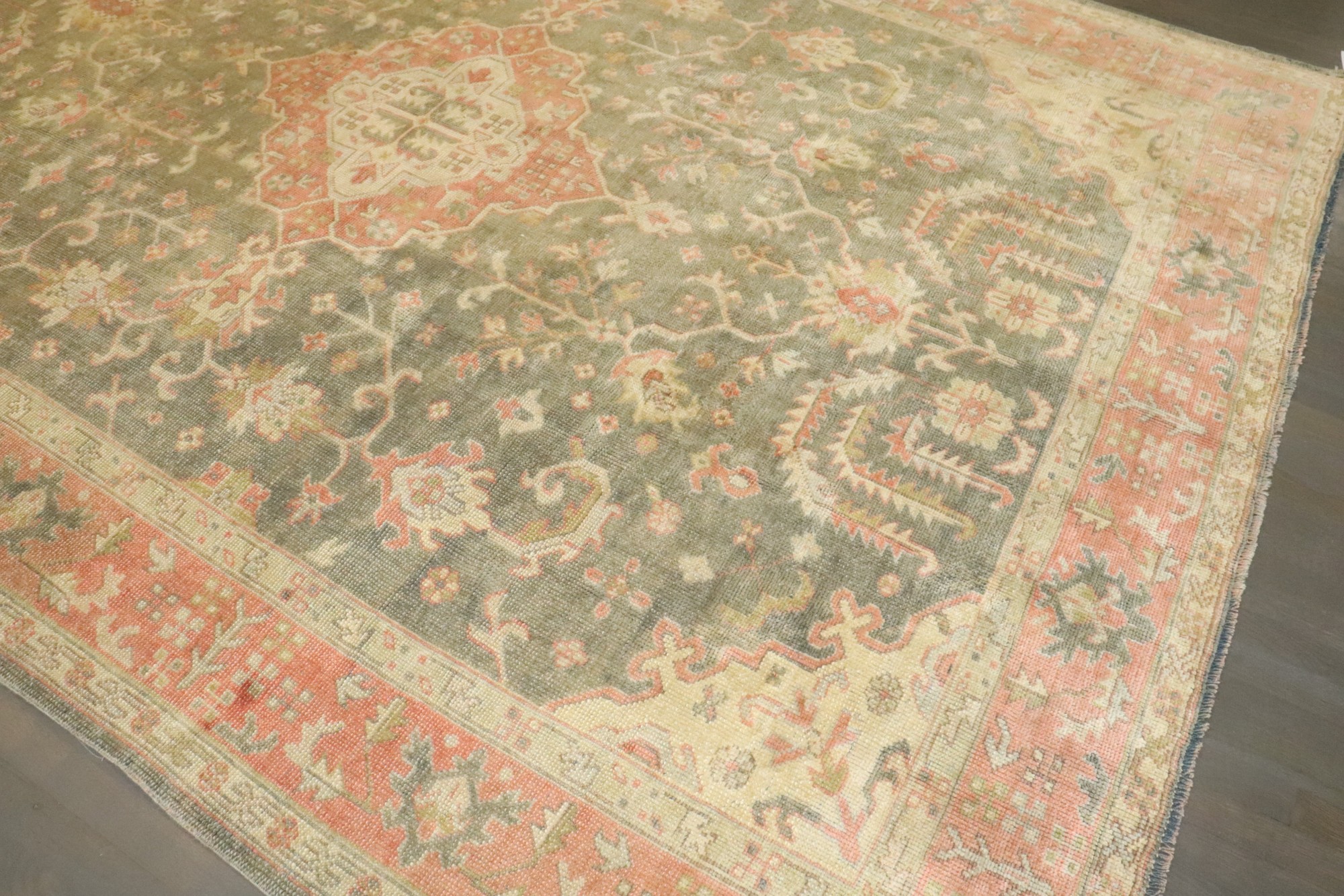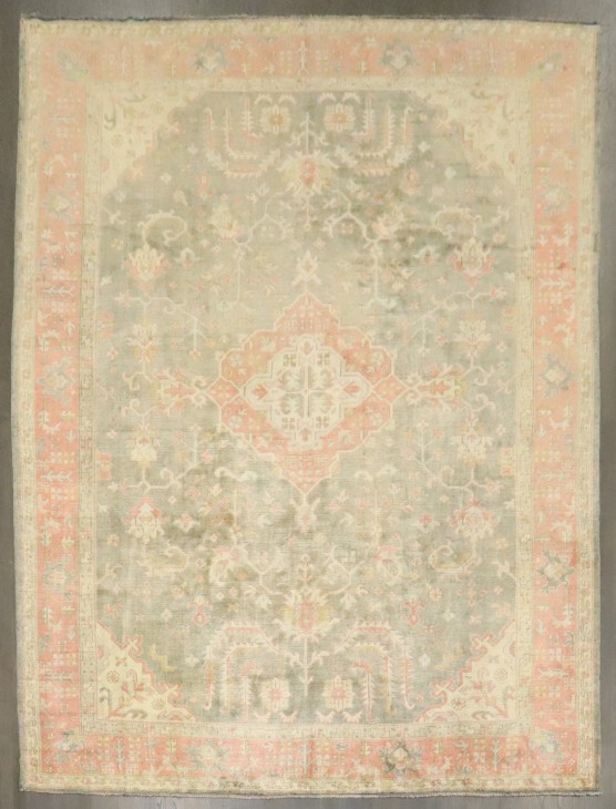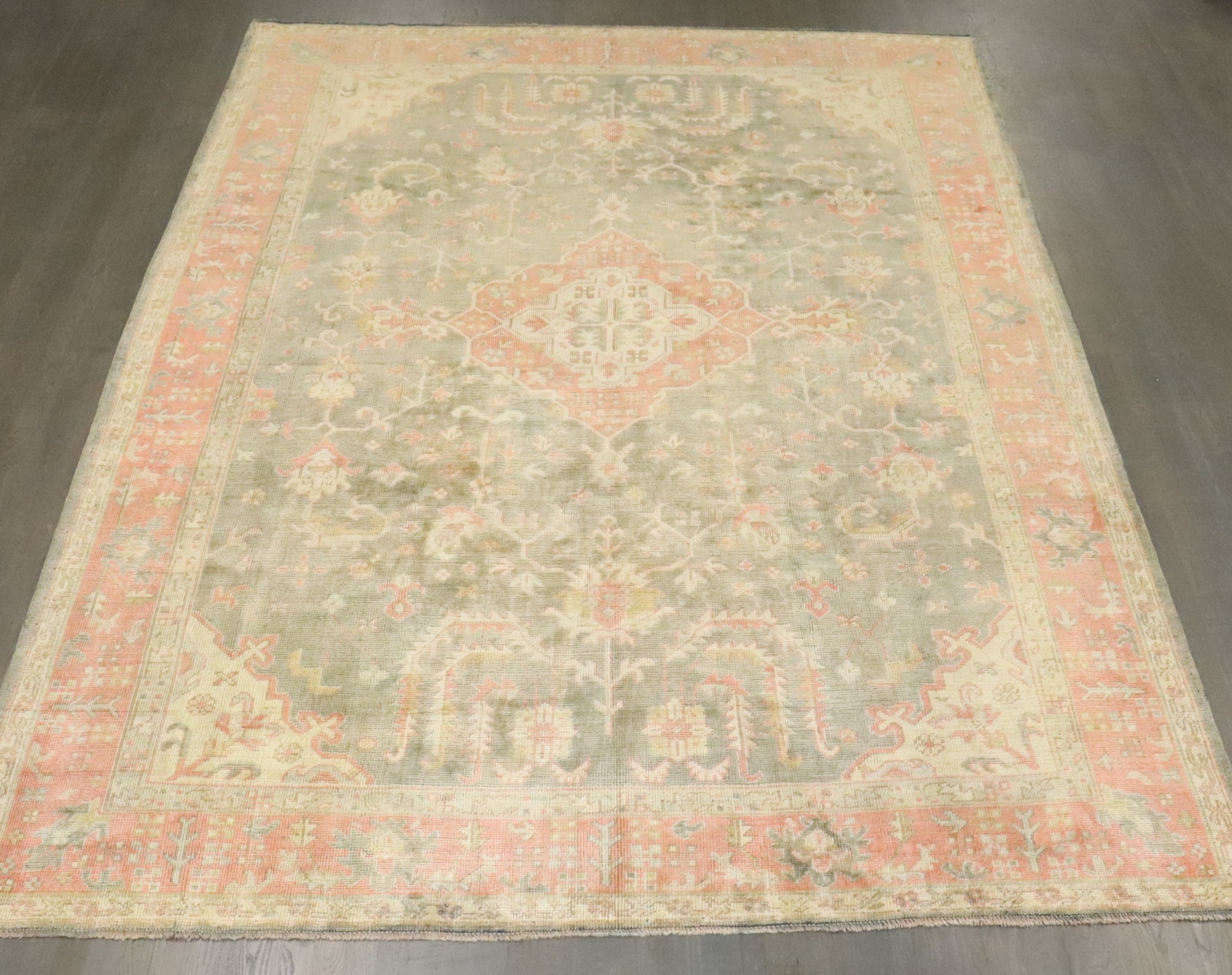1920s room size oushak in greens and pink