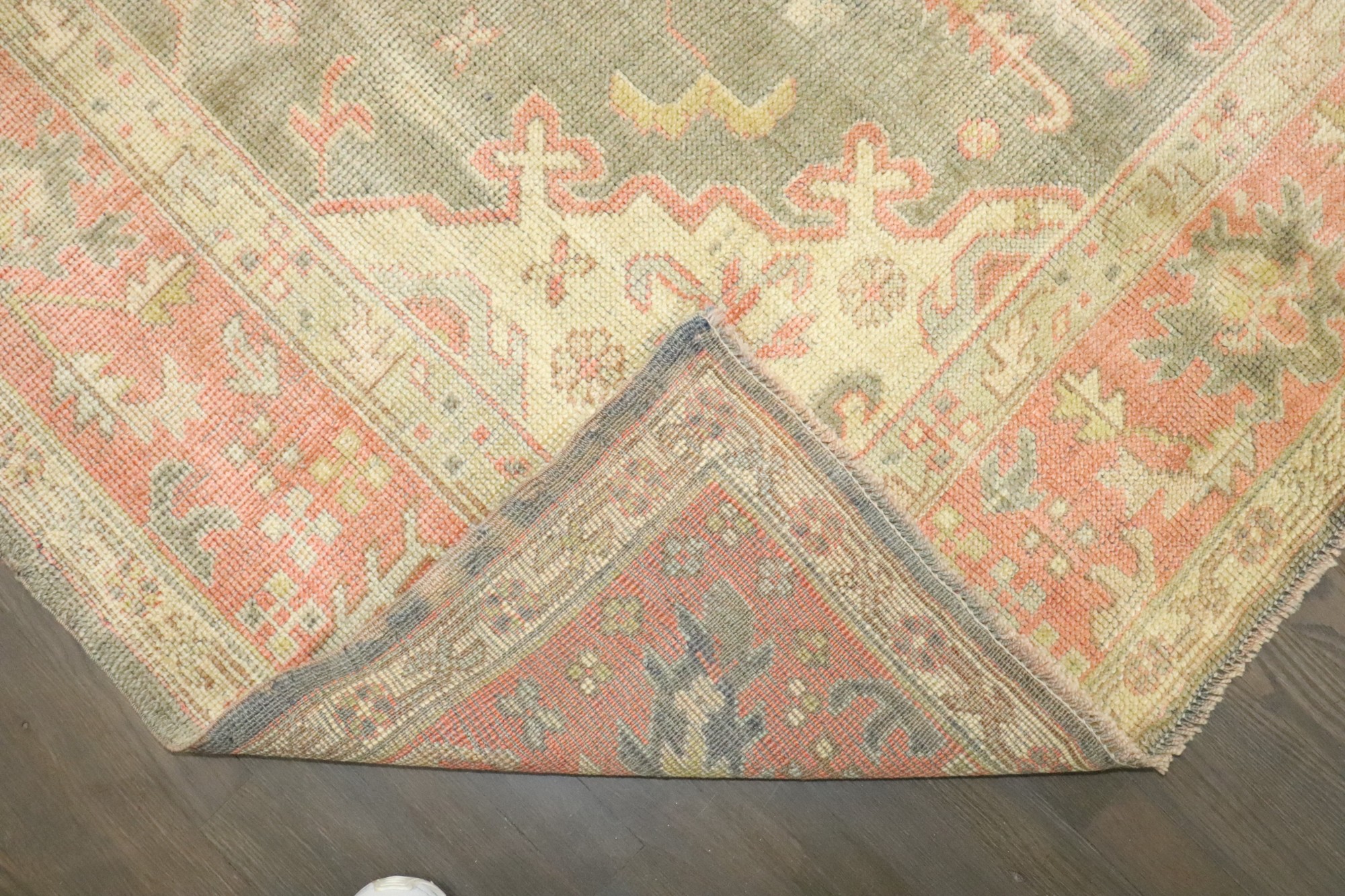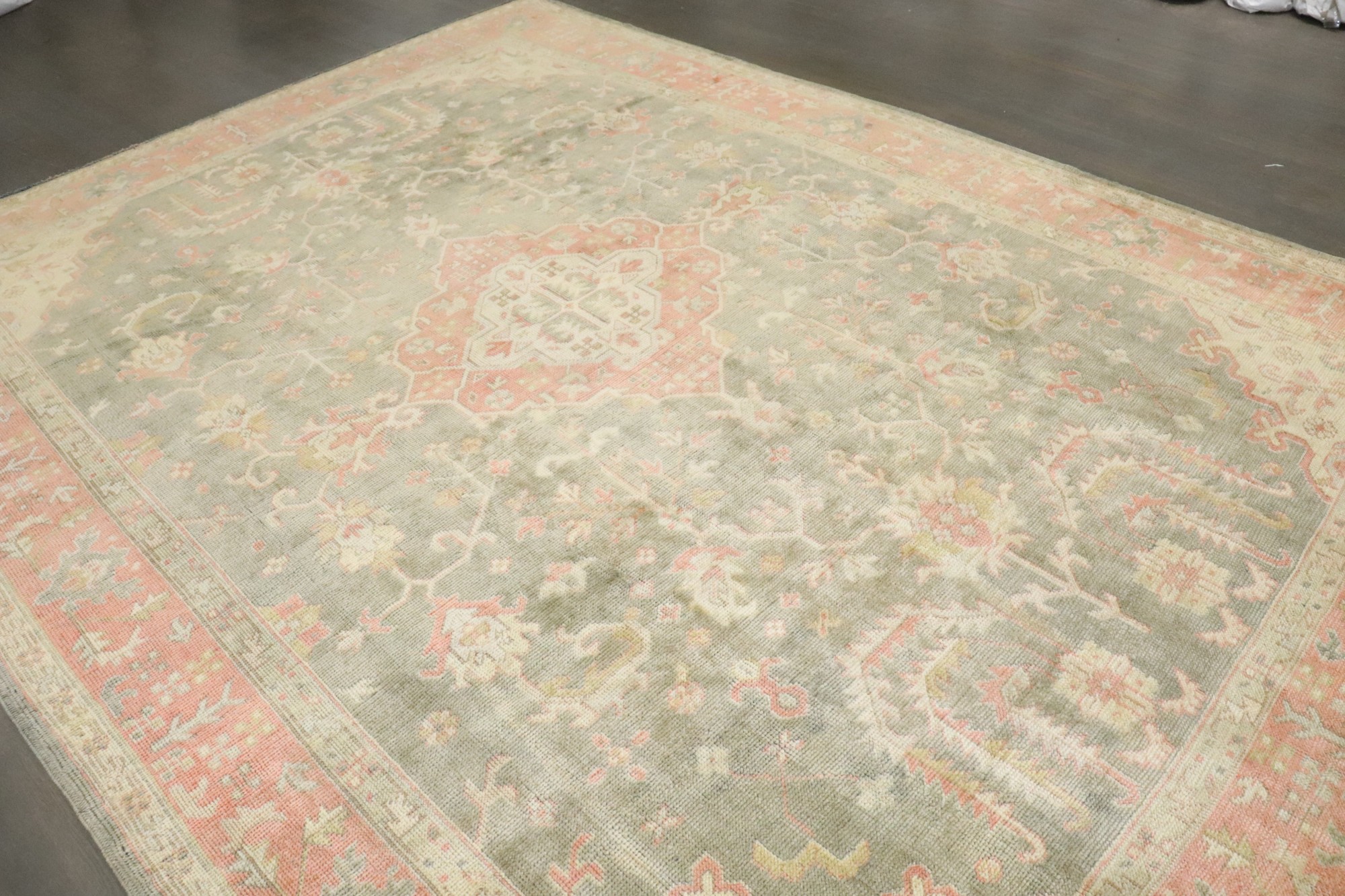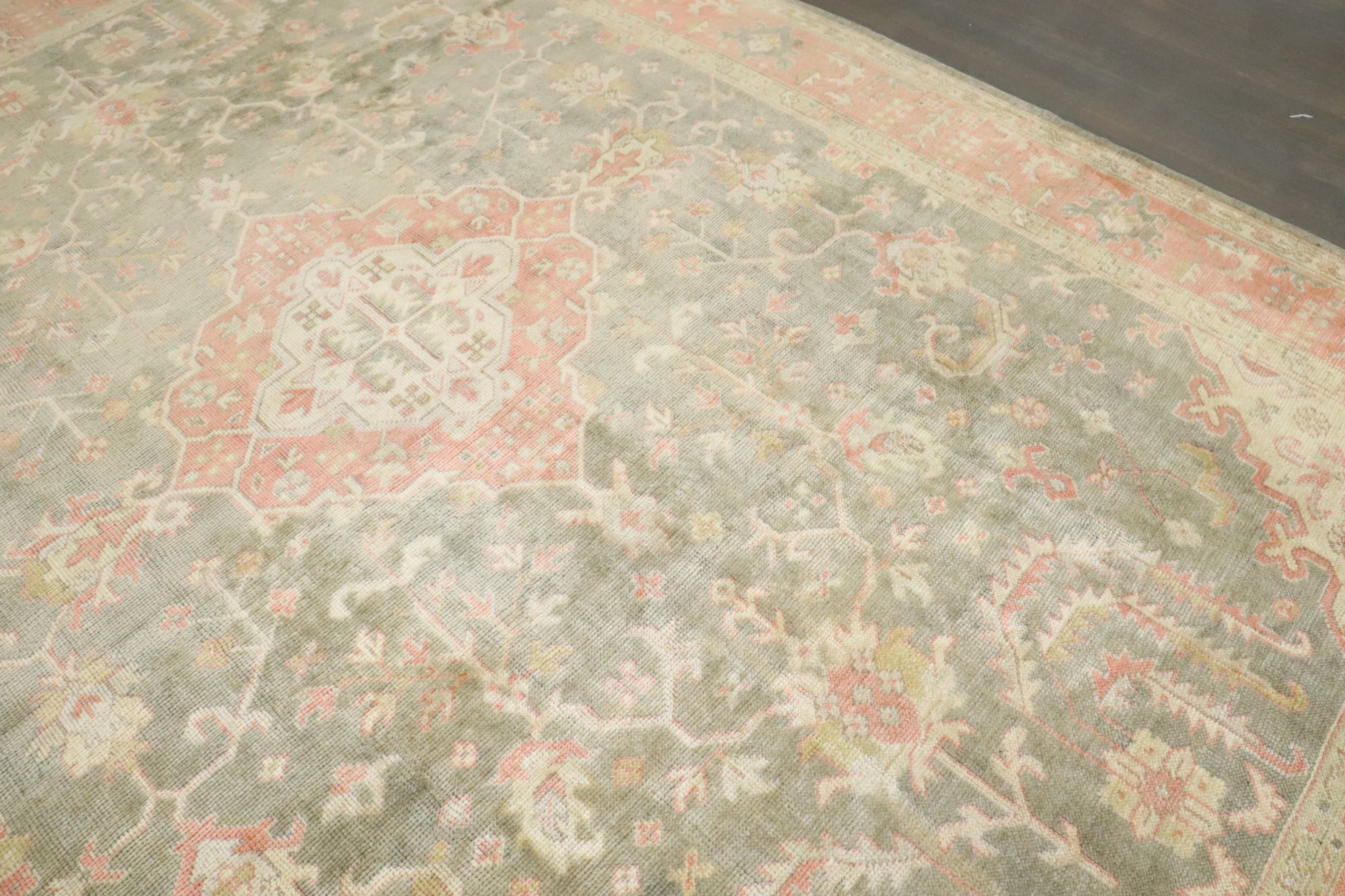 1920s room size oushak in greens and pink