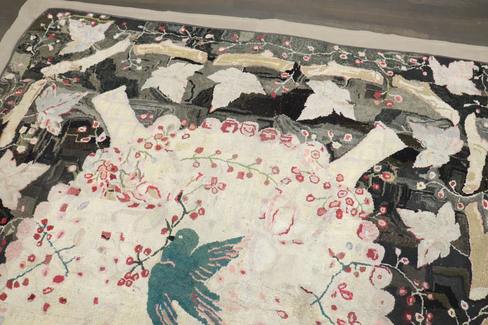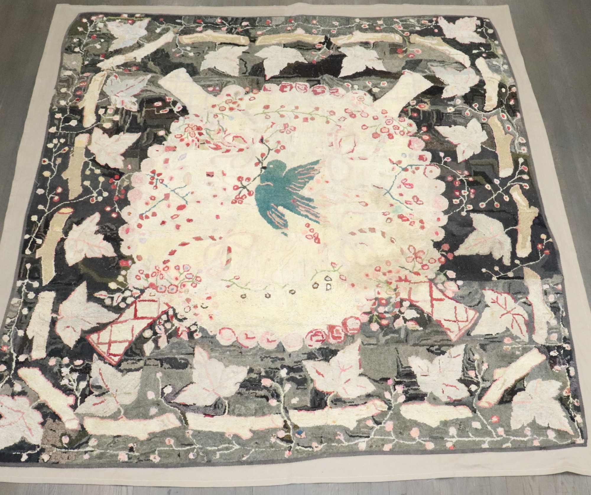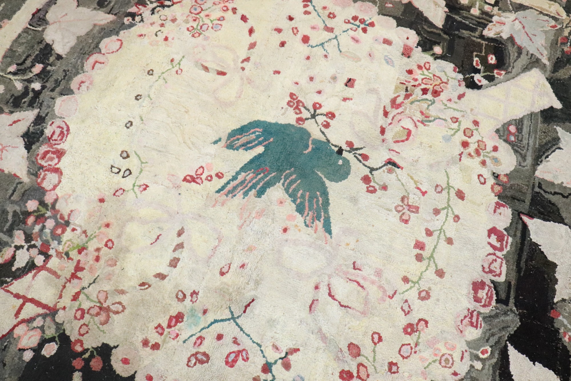 Stunning American Hooked Rug from the early 20th century with a green bird in the center of an enchanting floral pattern. Backed in Linen