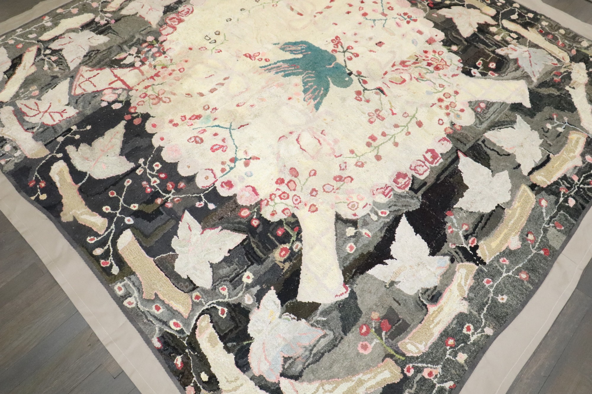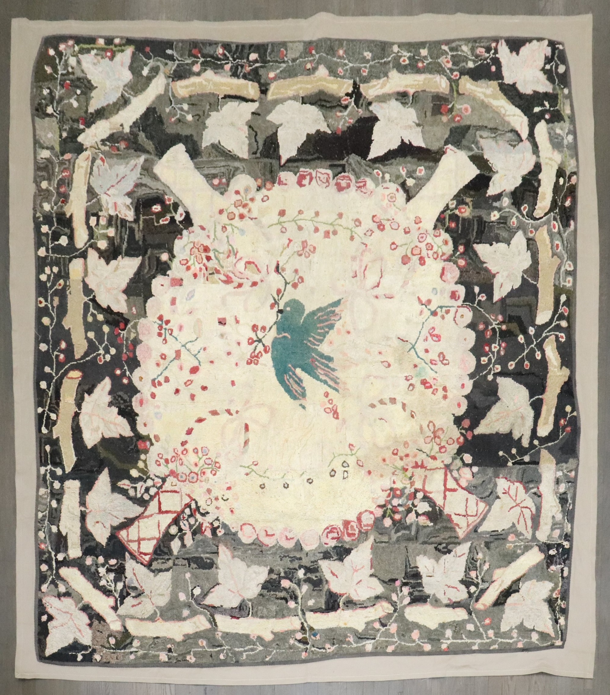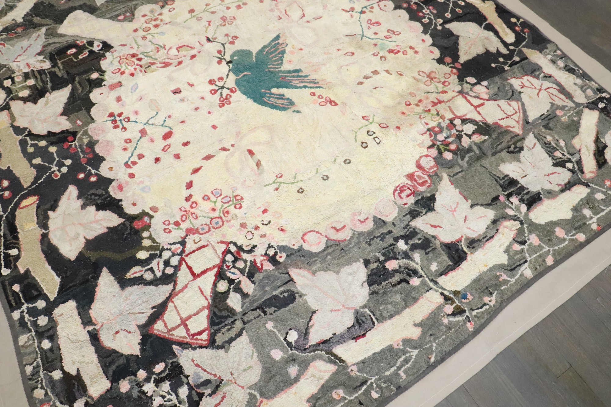 Stunning American Hooked Rug from the early 20th century with a green bird in the center of an enchanting floral pattern. Backed in Linen