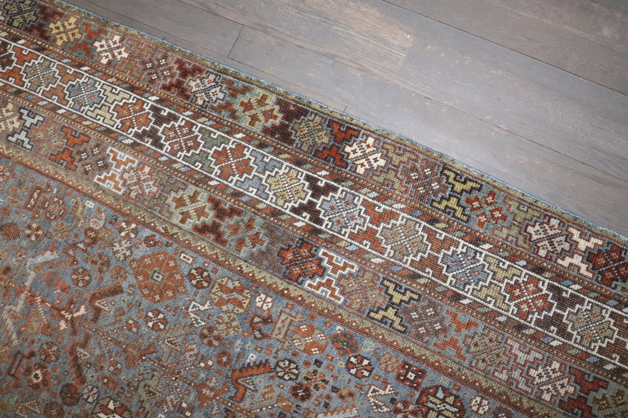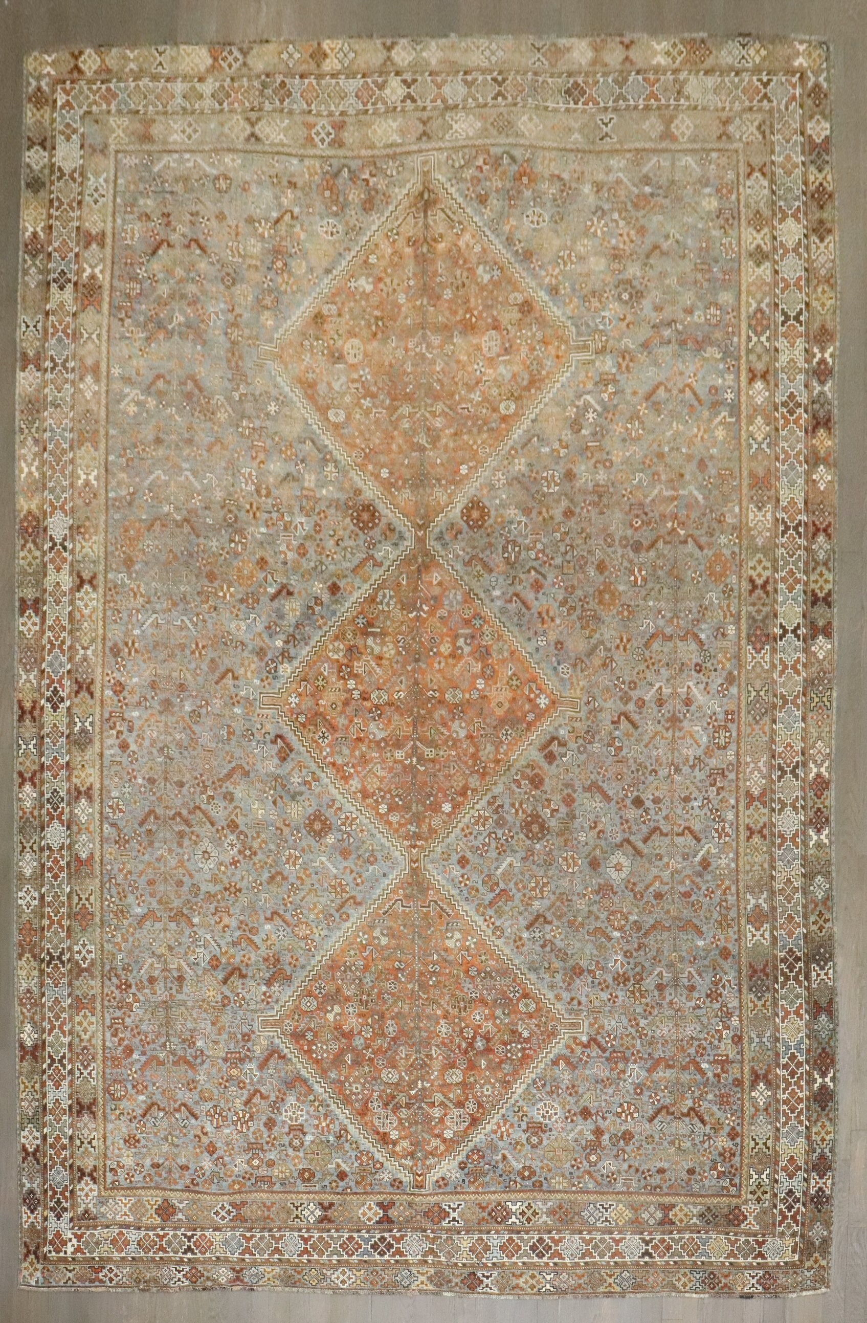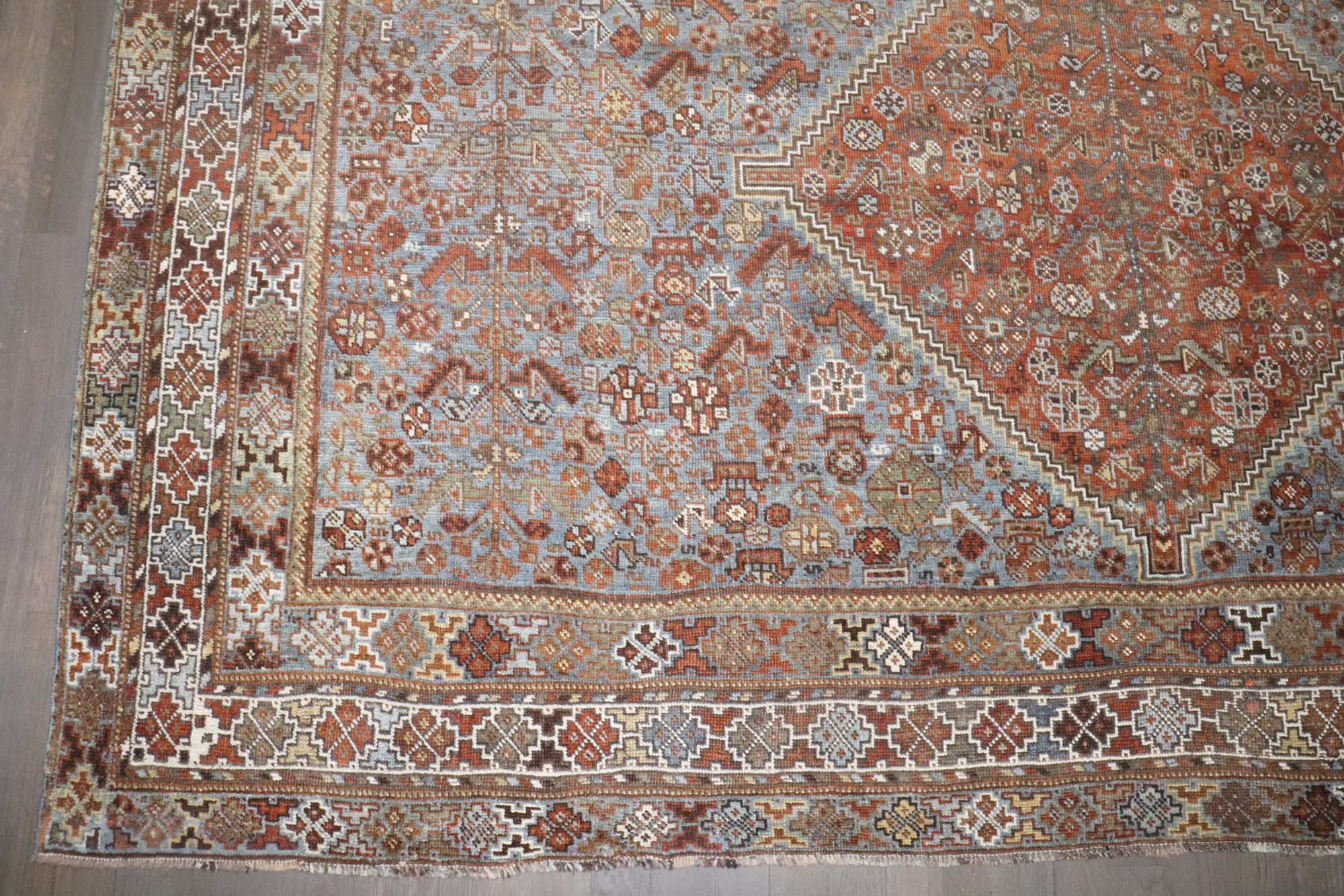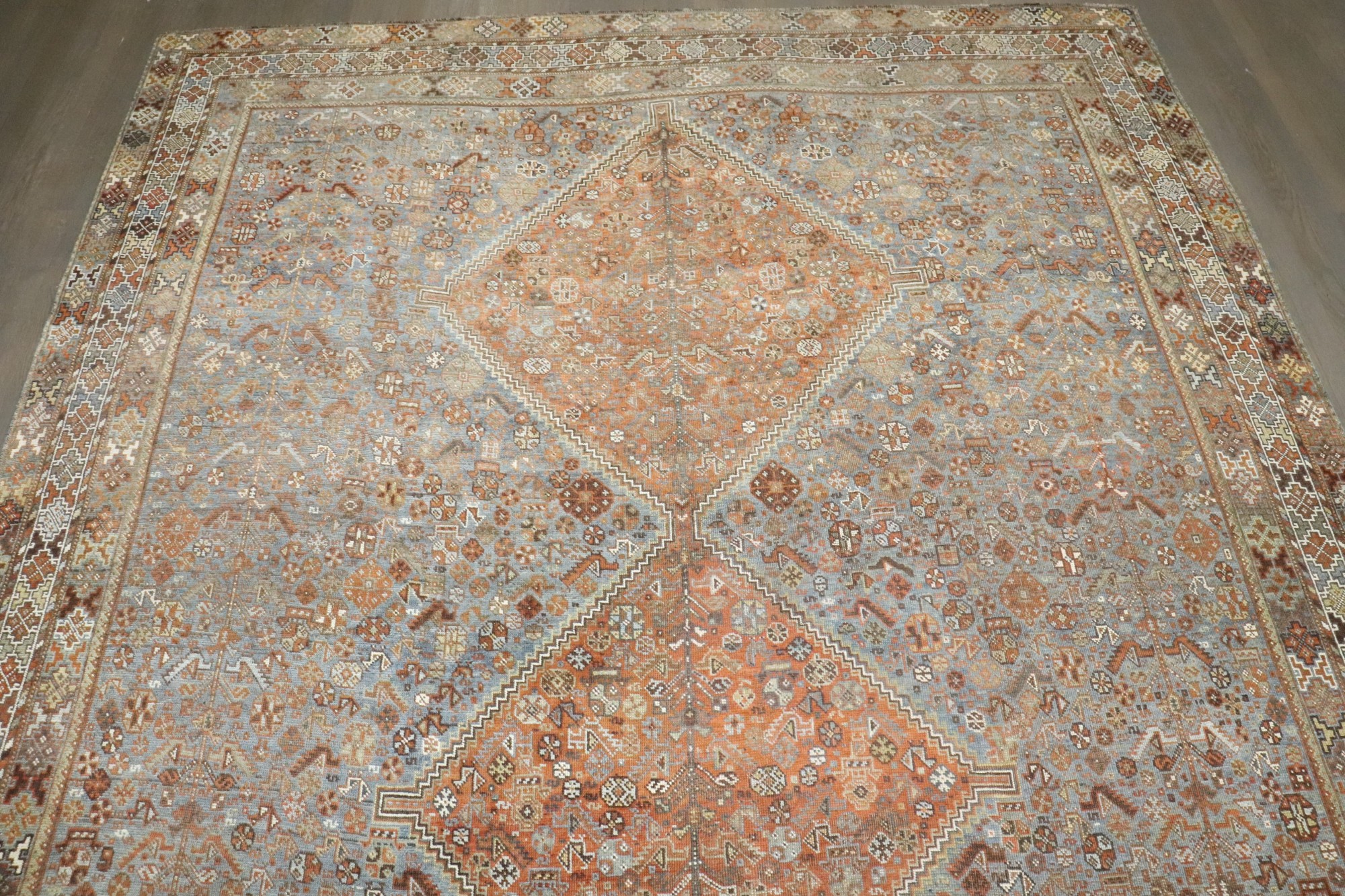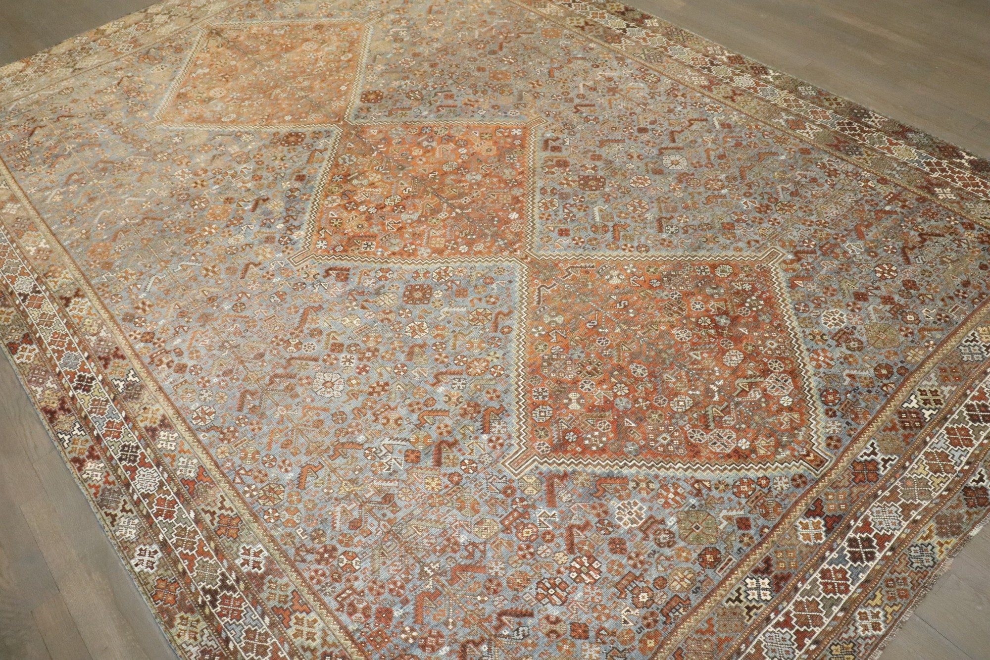 a room size tribal geometric shiraz rug from the early 20th century