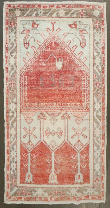 a Turkish anatolian rug with a prayer niche design dated 1969