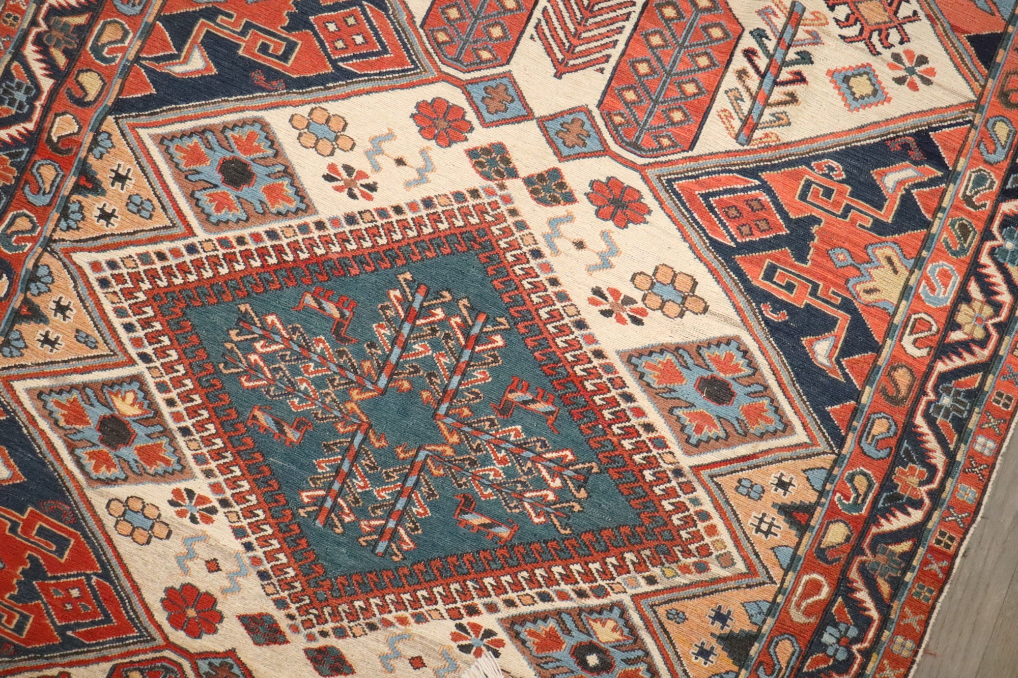 This is a Caucasian Soumak (Sumak) flatweave, likely from the Azerbaijan / Shirvan / Kuba region. The design, weave structure, and colors match 20th-century Soumak workshop pieces, not the older tribal antique ones from the early 20th century and late 19th century