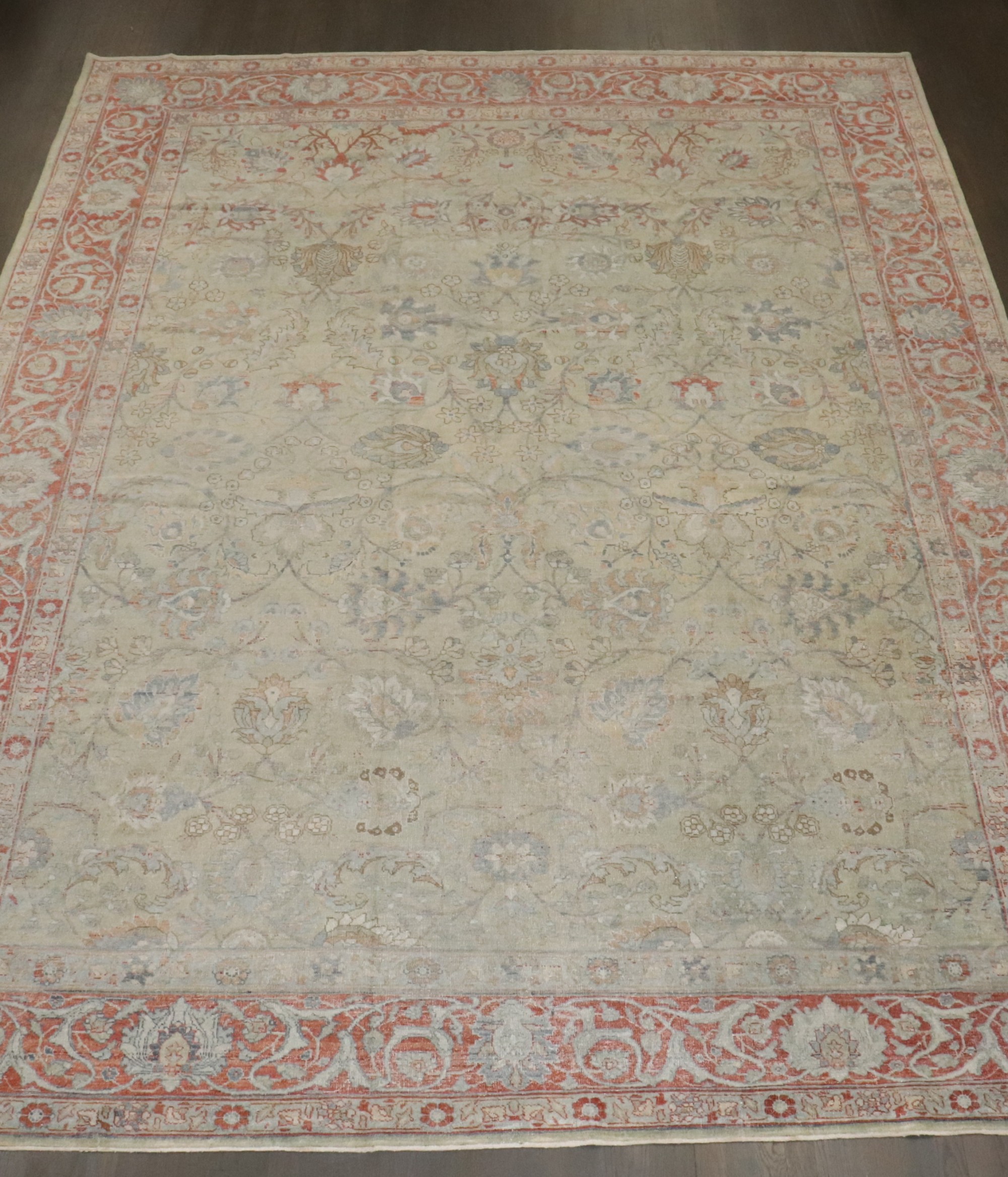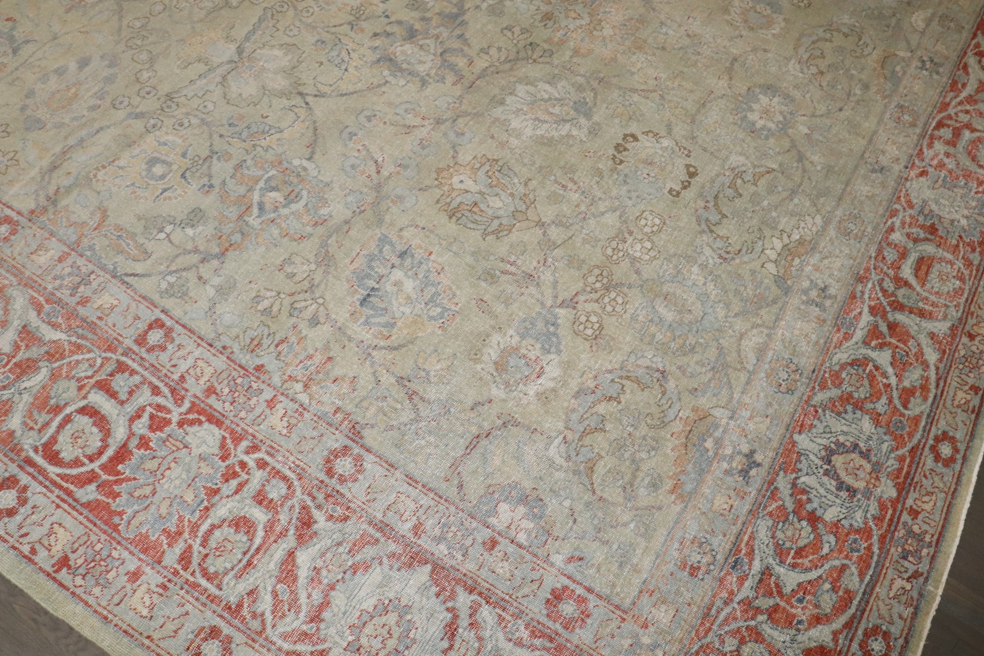 1930s Room Size Persian Tabriz Rug with a sea foam green field and red border