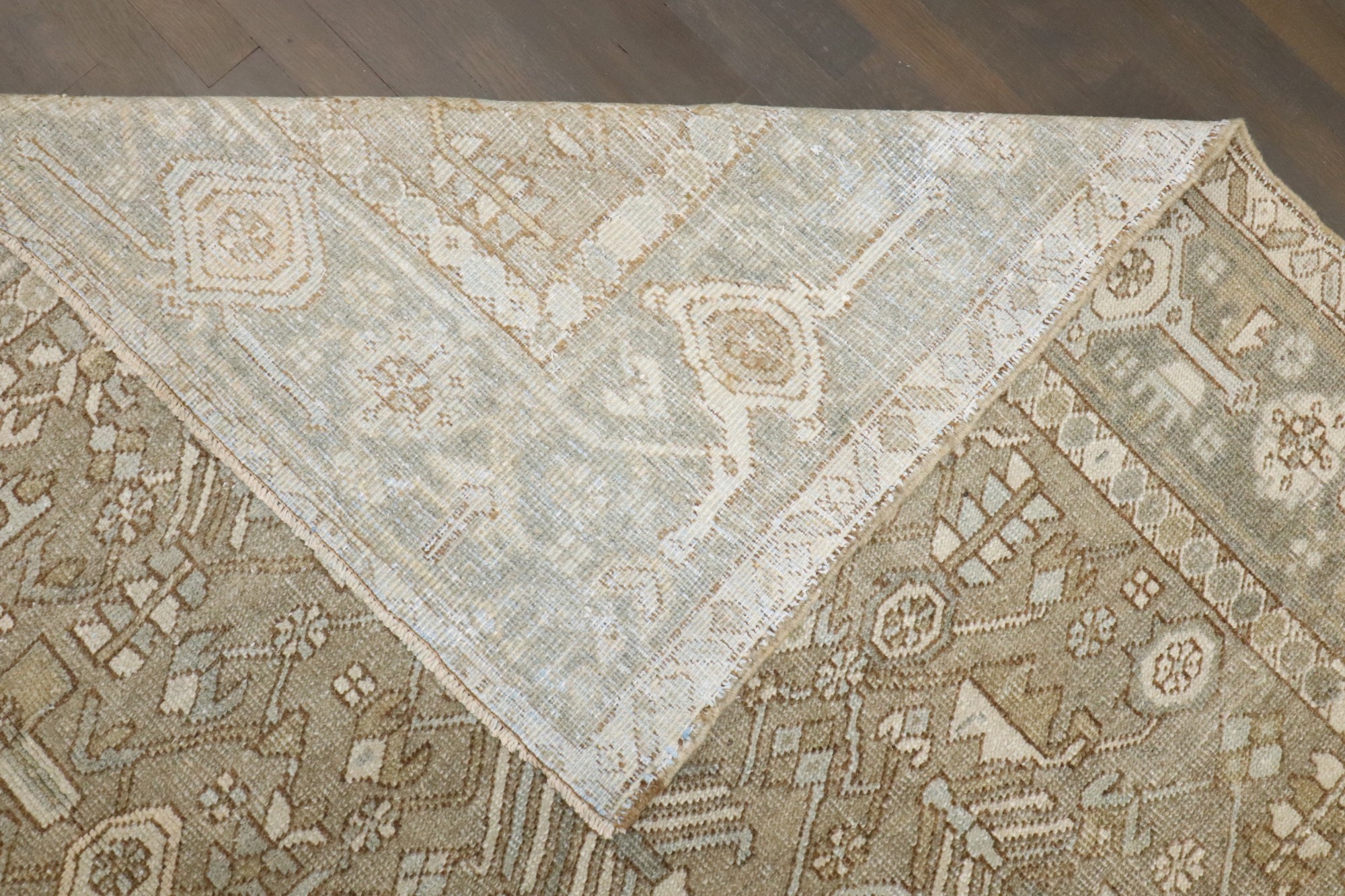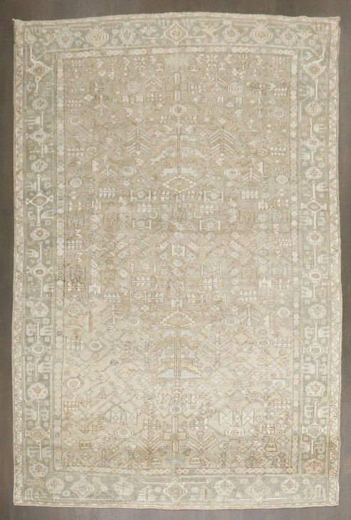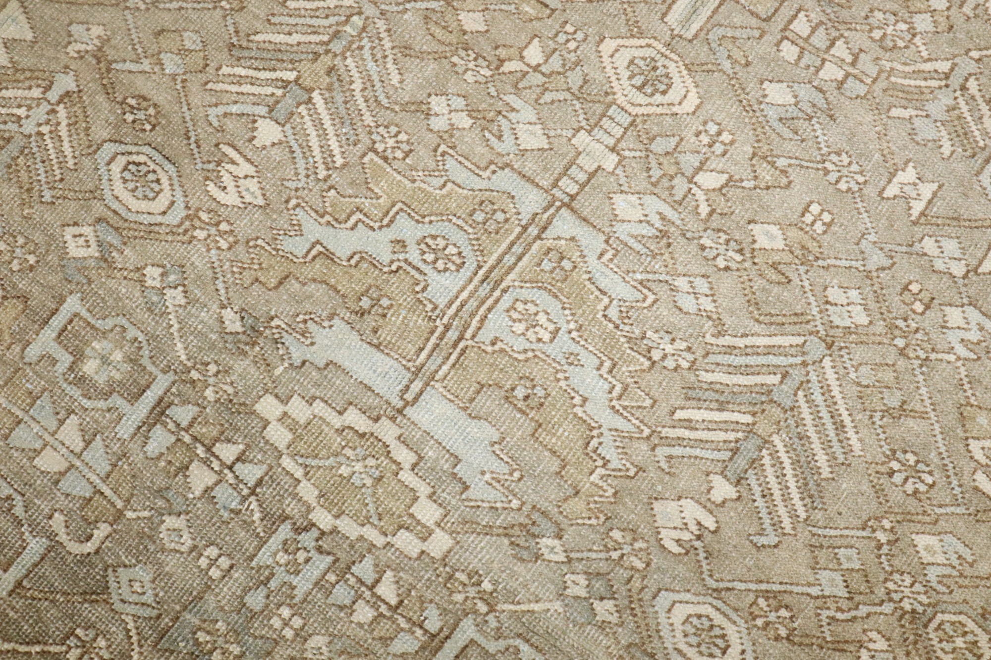 a small room size Persian Heriz Rug in predominantly taupe, accent colors in soft blues and greens