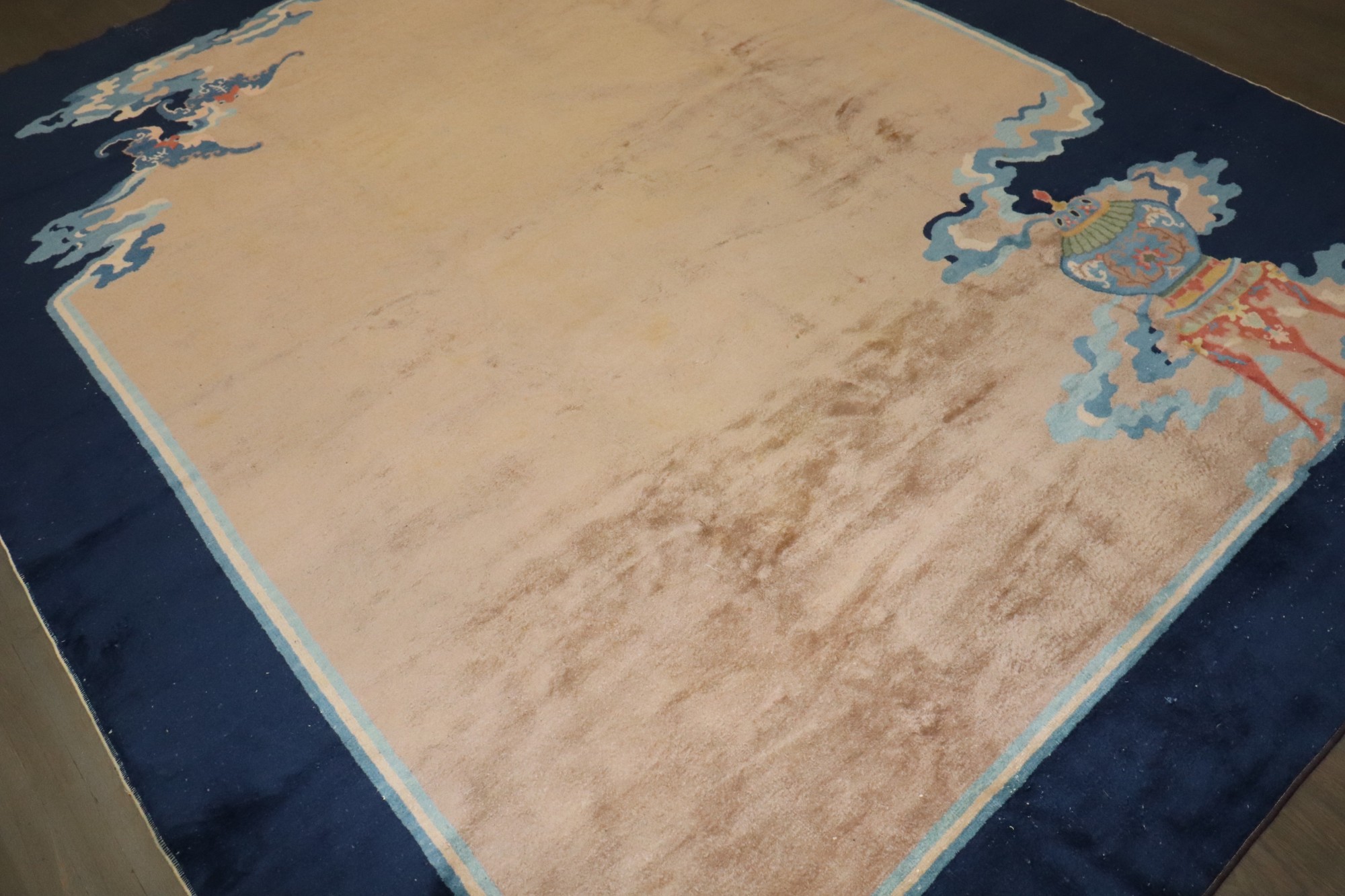 a 1940s Art Deco Chinese rug in tans and navy