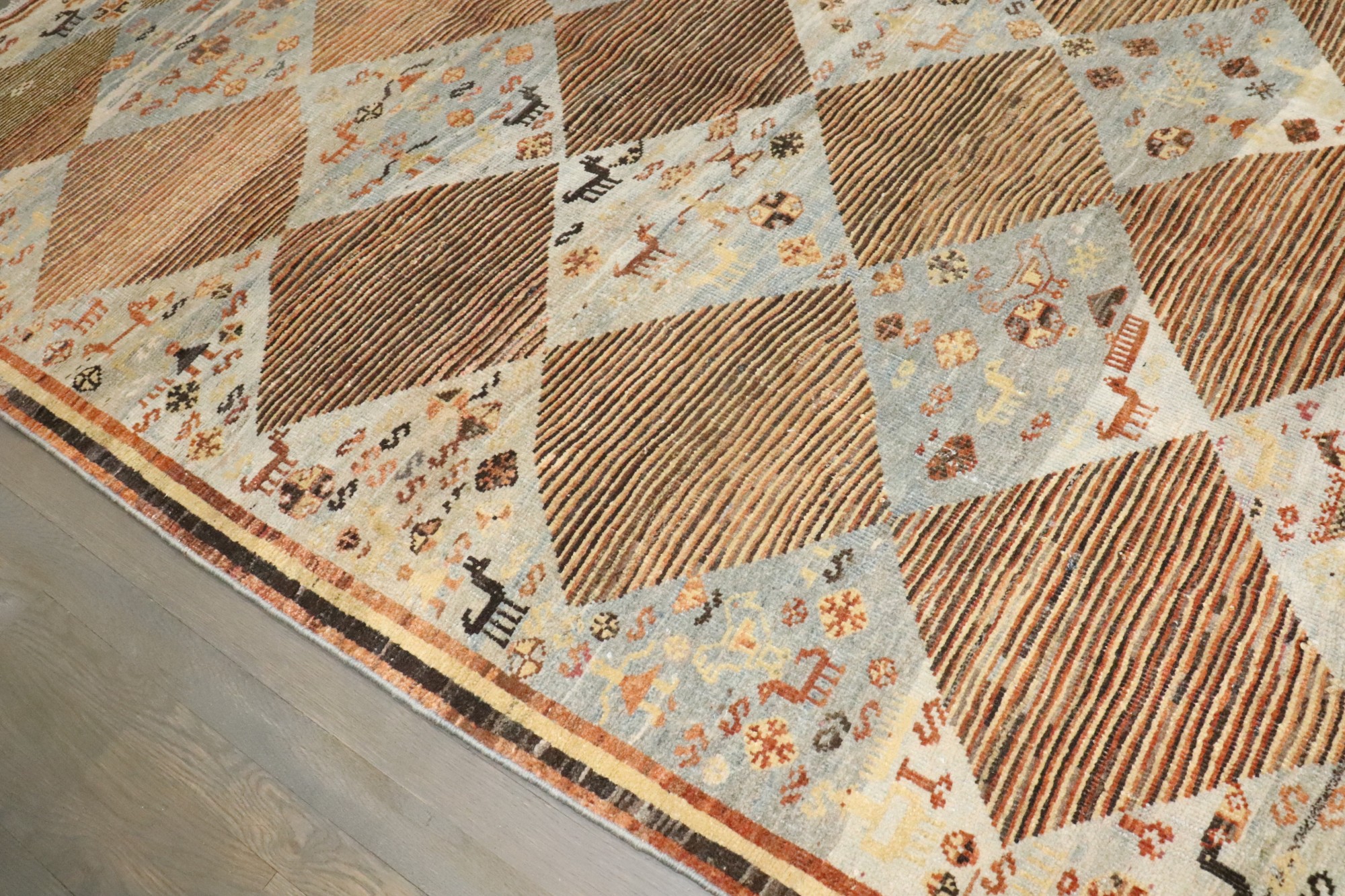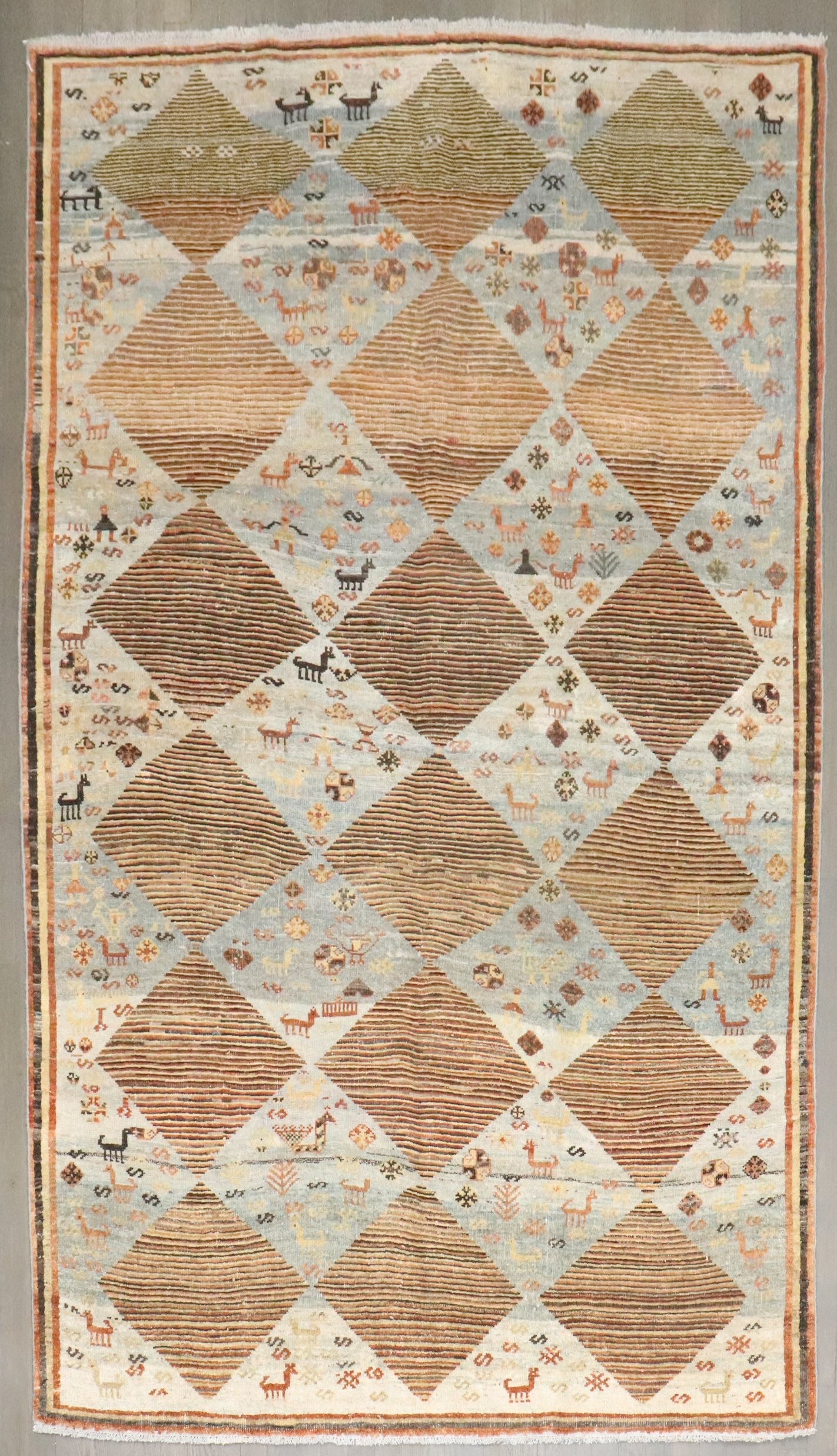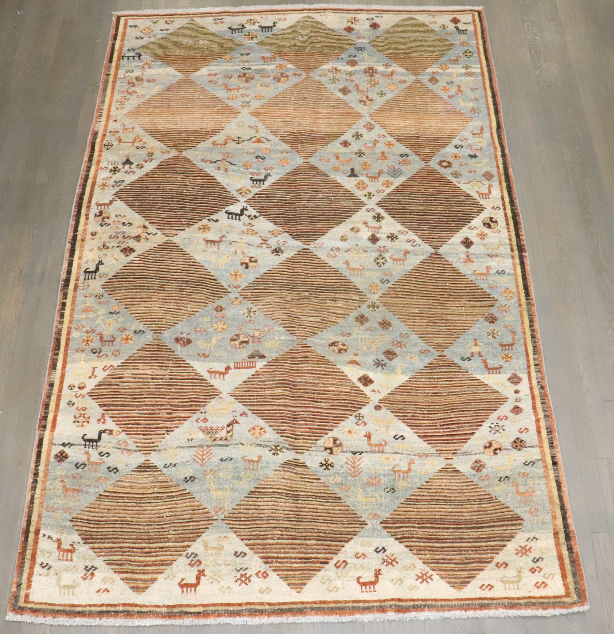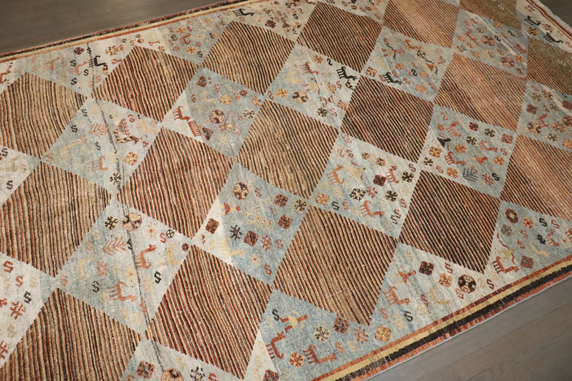 an intermediate size Persian Gabbeh rug made in the middle of the 20th century