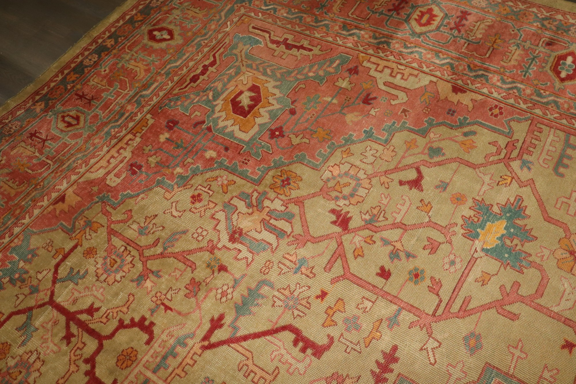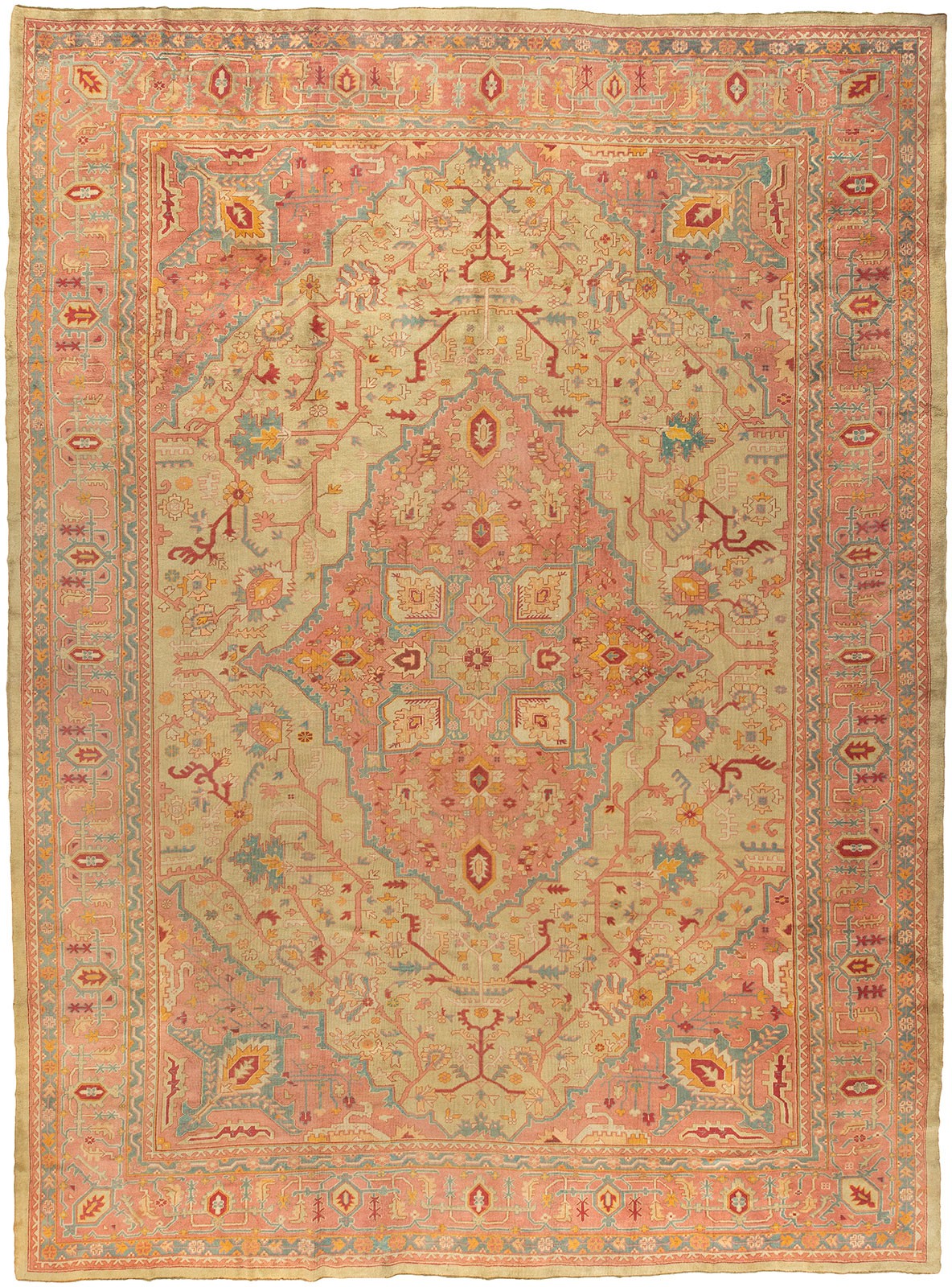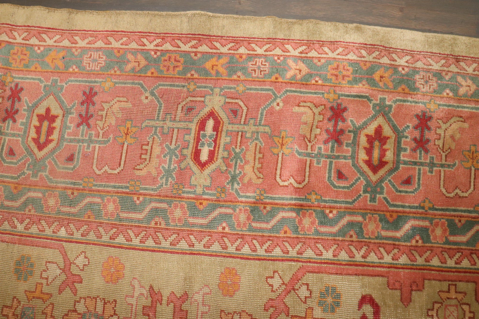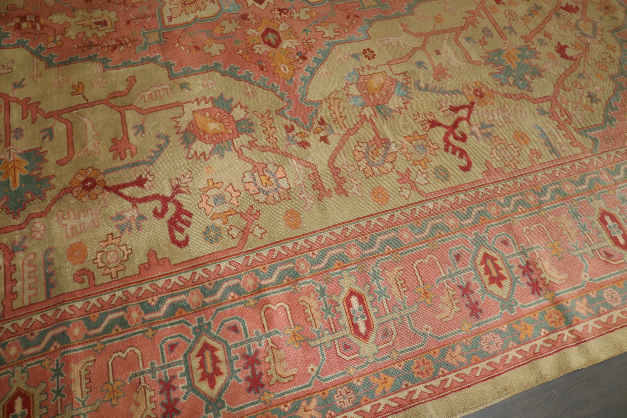An early 20th-century oversize green and pink Turkish Oushak carpet