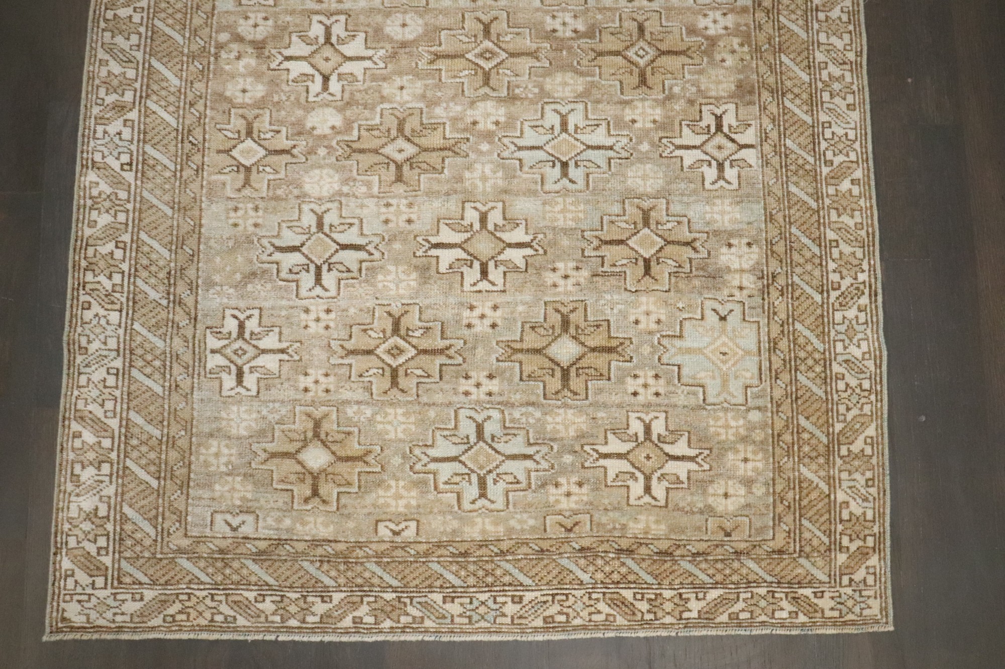 an early 20th century caucasian shirvan rug in light green and neutral tones