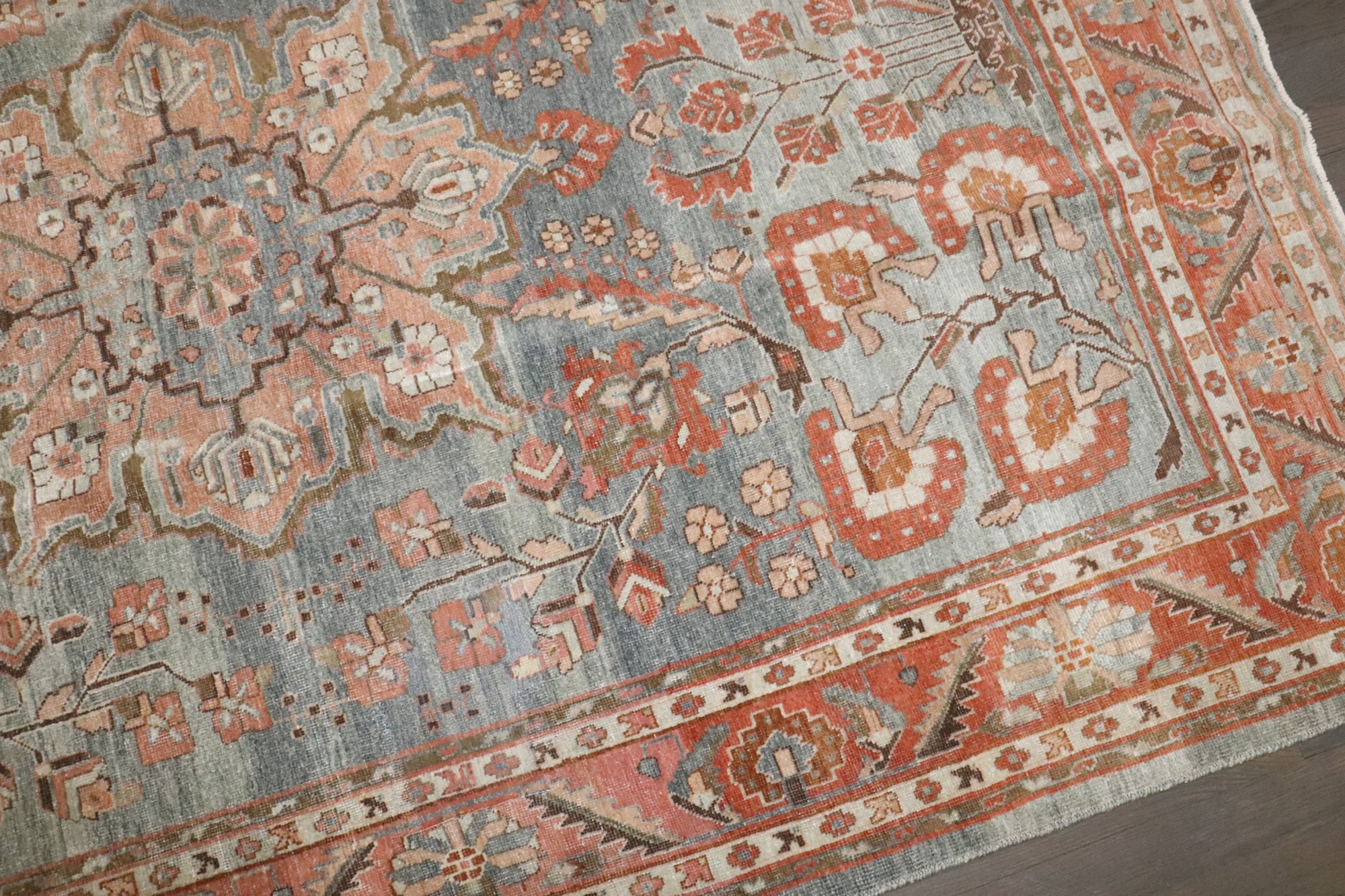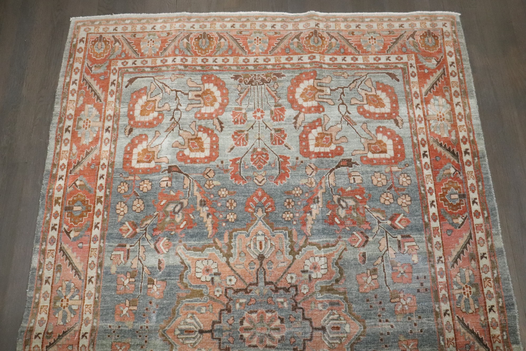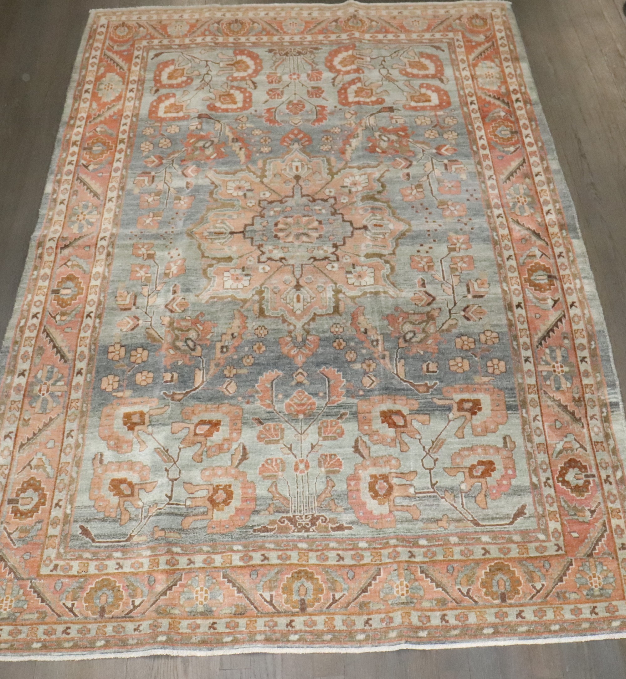 an antique 1920s Persian Sarouk Rug with salmon and terracotta accent blue gray field rug