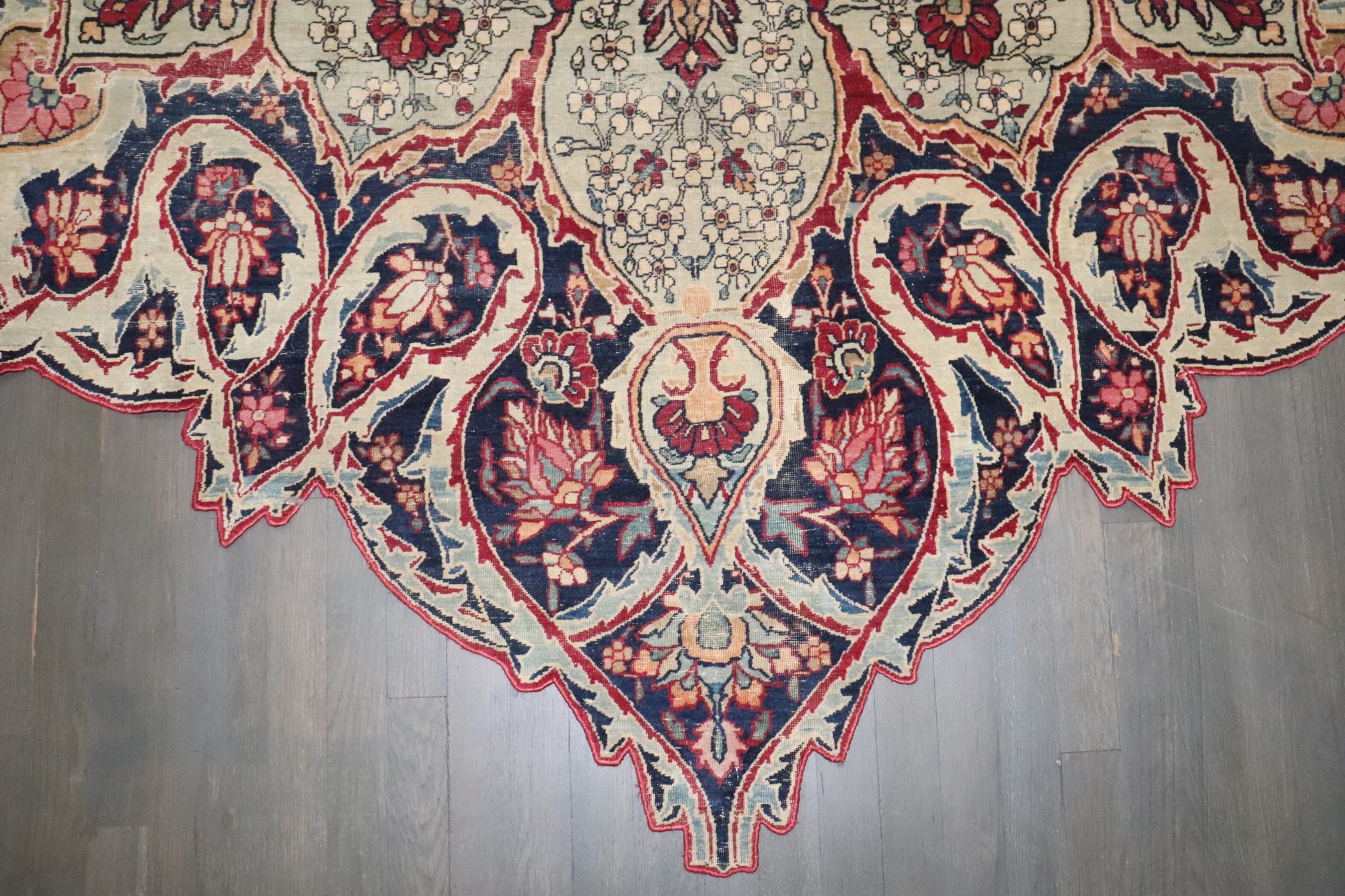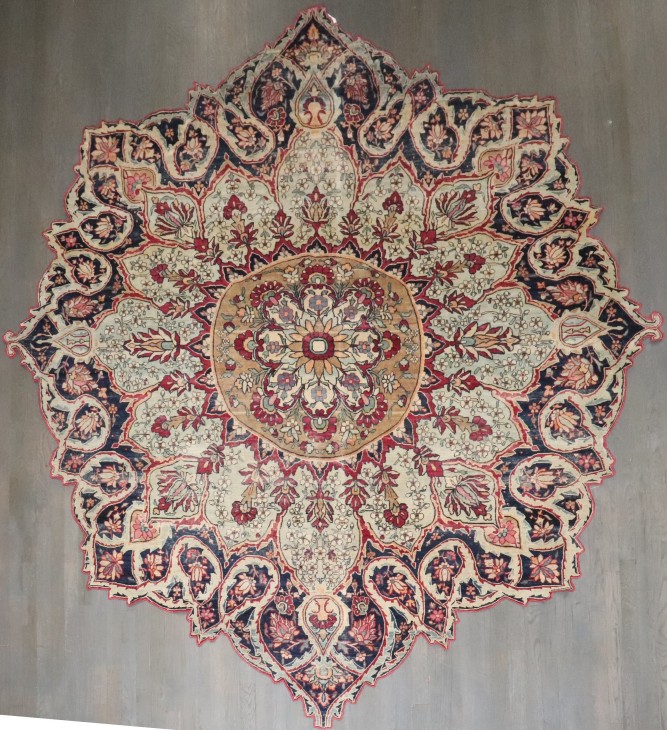This exceptional Persian Tabriz rug features a rare and highly sought-after scalloped medallion silhouette, showcasing the masterful curvilinear artistry for which Tabriz is celebrated. Hand-knotted in Iran during the late 19th century, the rug displays an intricate arrangement of floral palmettes, scrolling vines, and layered petals, all radiating from an ornate circular central medallion. The palette blends soft ivory, warm gold, deep navy, and rich burgundy, creating a sophisticated yet inviting aesthetic. The unusually shaped border—composed of repeating lobed motifs—elevates this rug from traditional to sculptural, making it a true statement piece suitable for refined interiors. Crafted from high-quality wool on a cotton foundation, the rug retains a supple handle and beautifully aged character. Its organic outline allows it to function not only as a floor covering but as decorative art within a room.