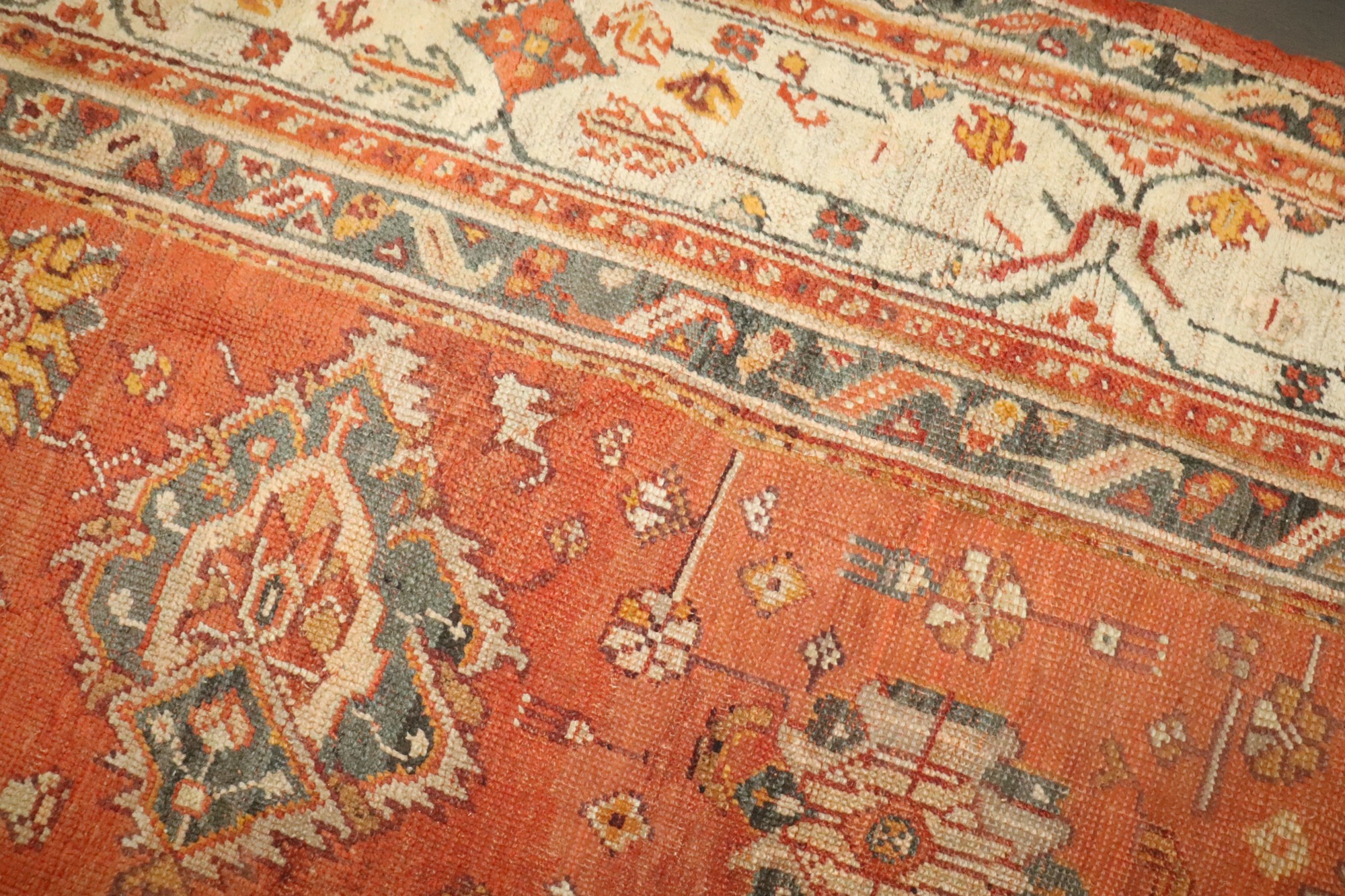 a large late 19th Century Antique Oushak rug featuring a large scale all over design floating on a pumpkin orange field and white border