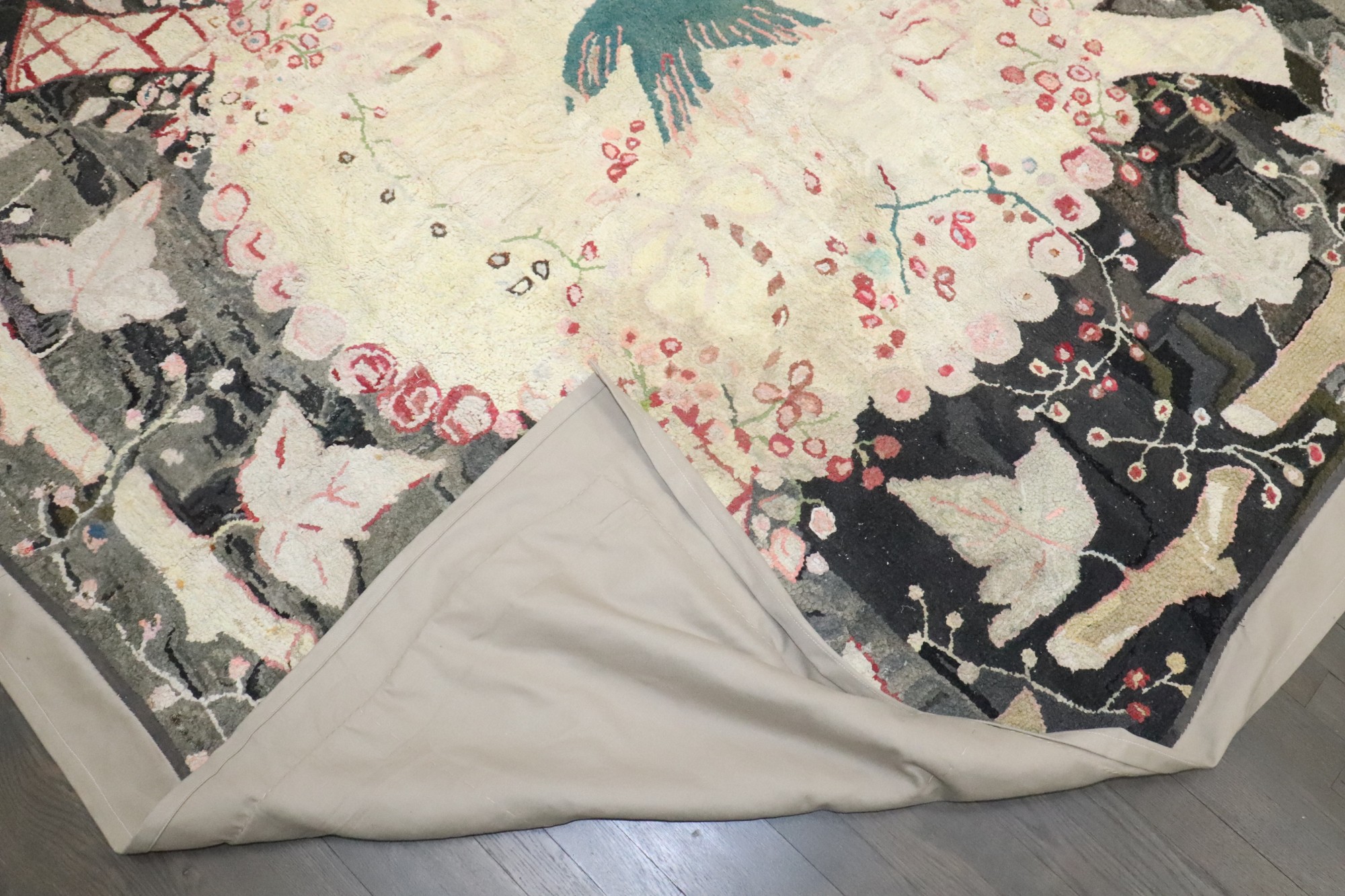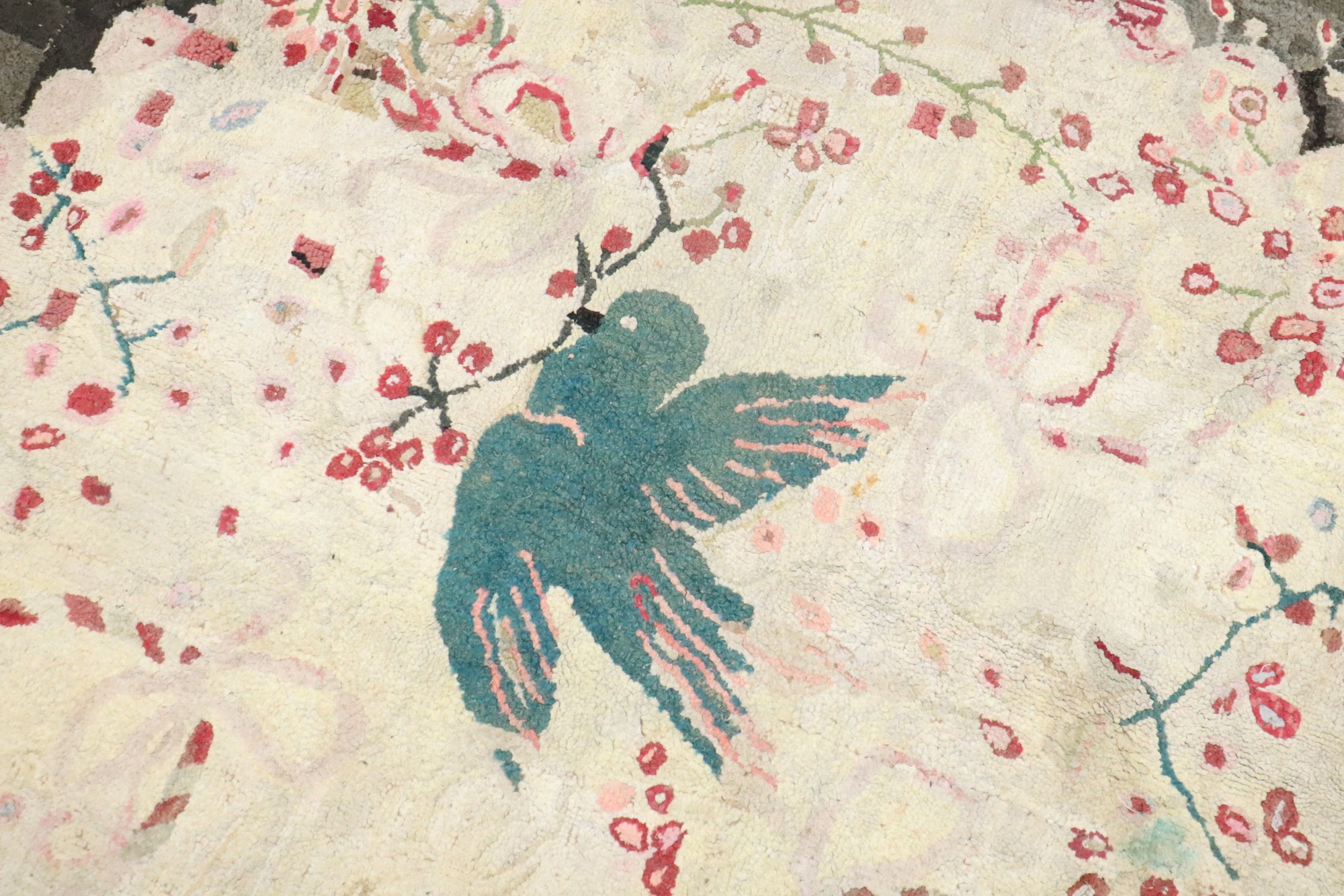 Stunning American Hooked Rug from the early 20th century with a green bird in the center of an enchanting floral pattern. Backed in Linen