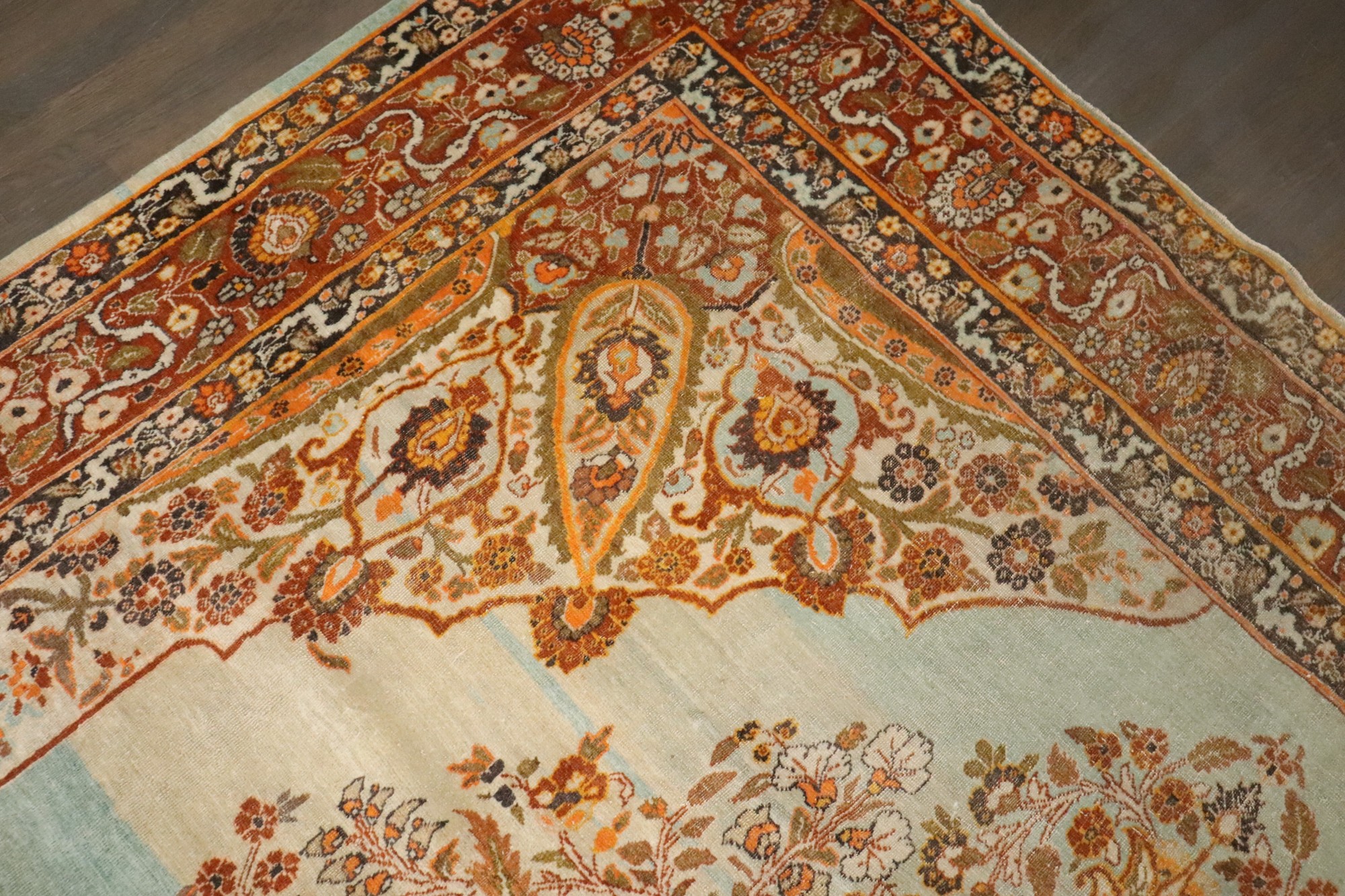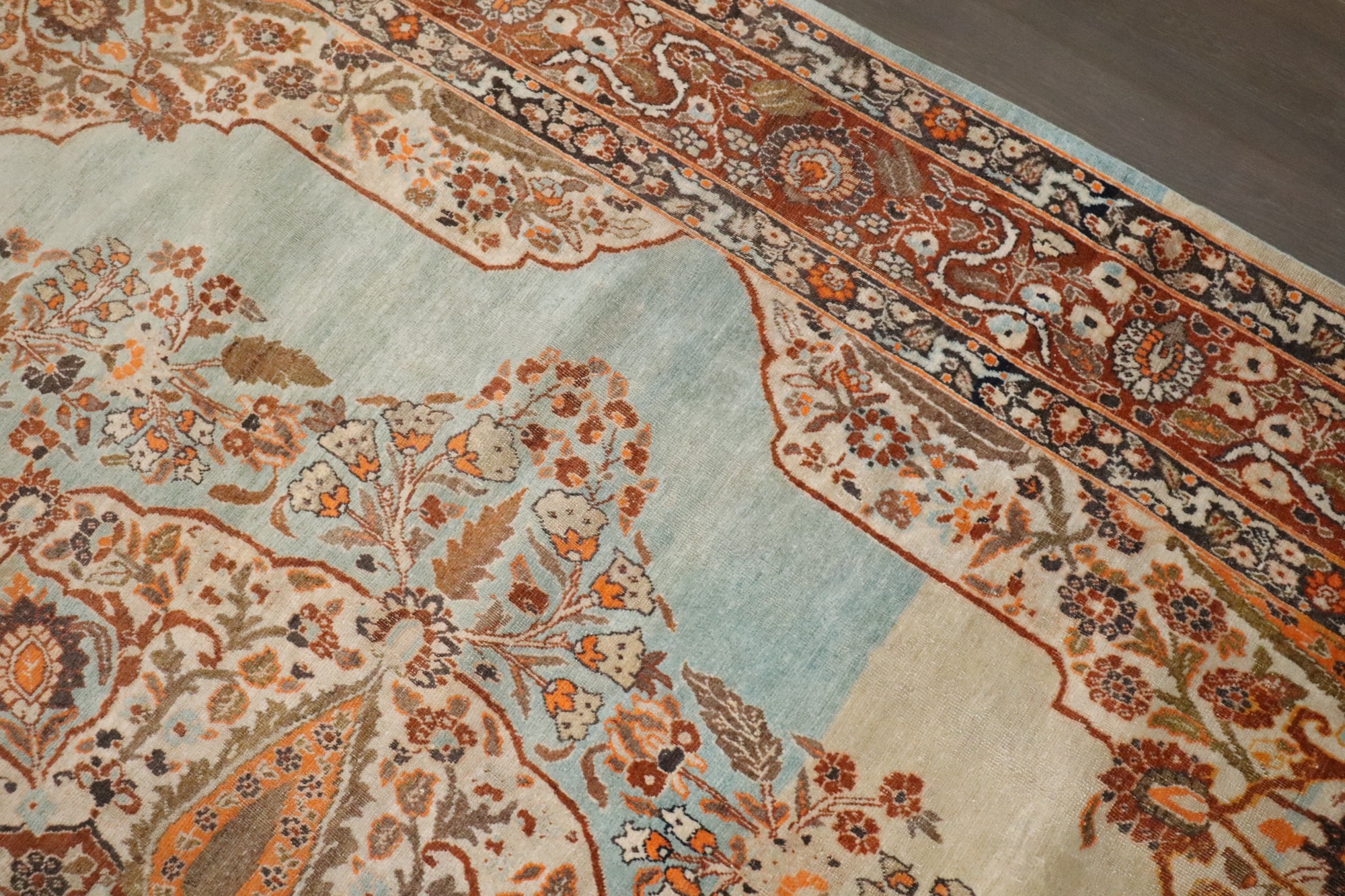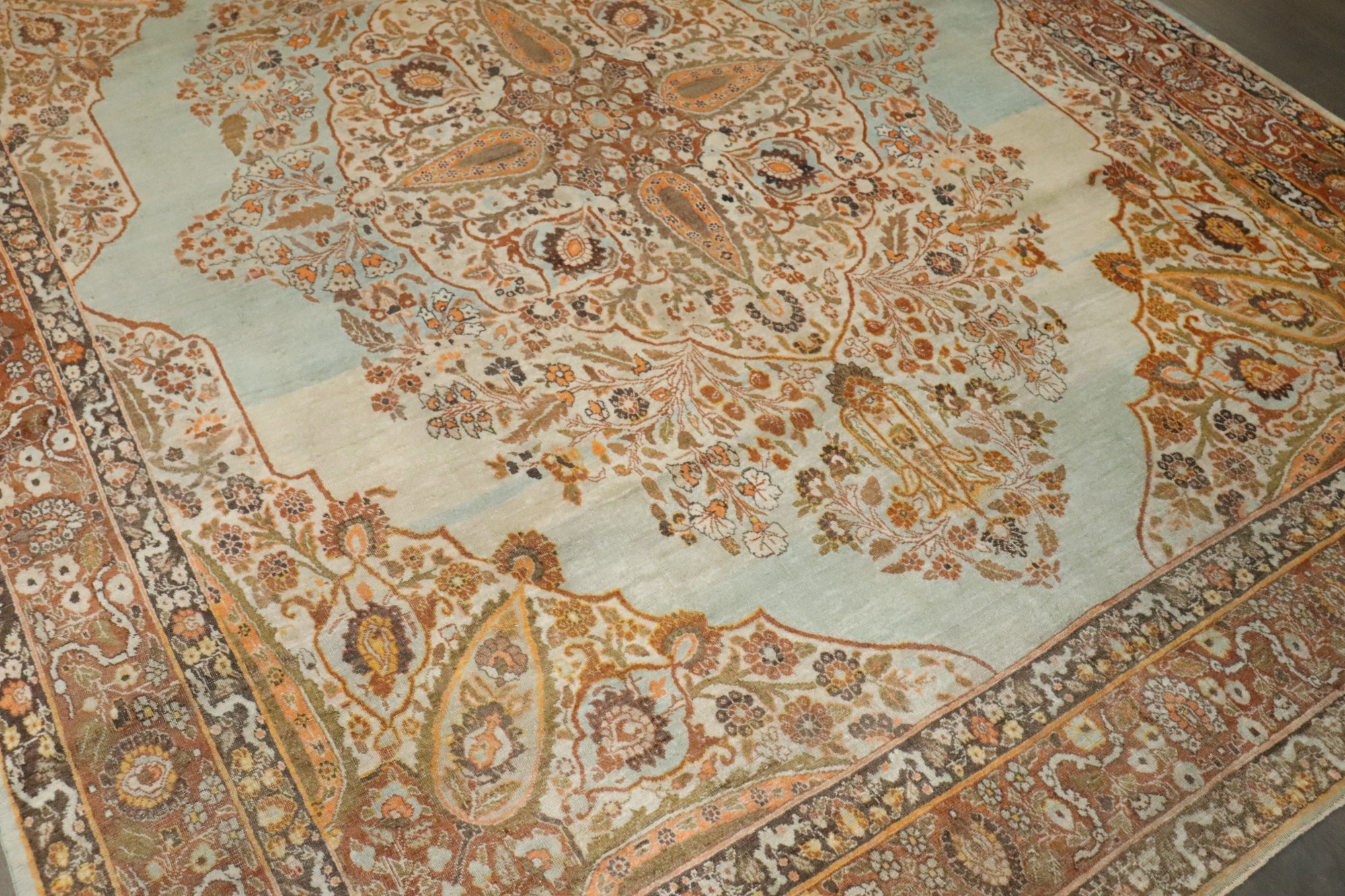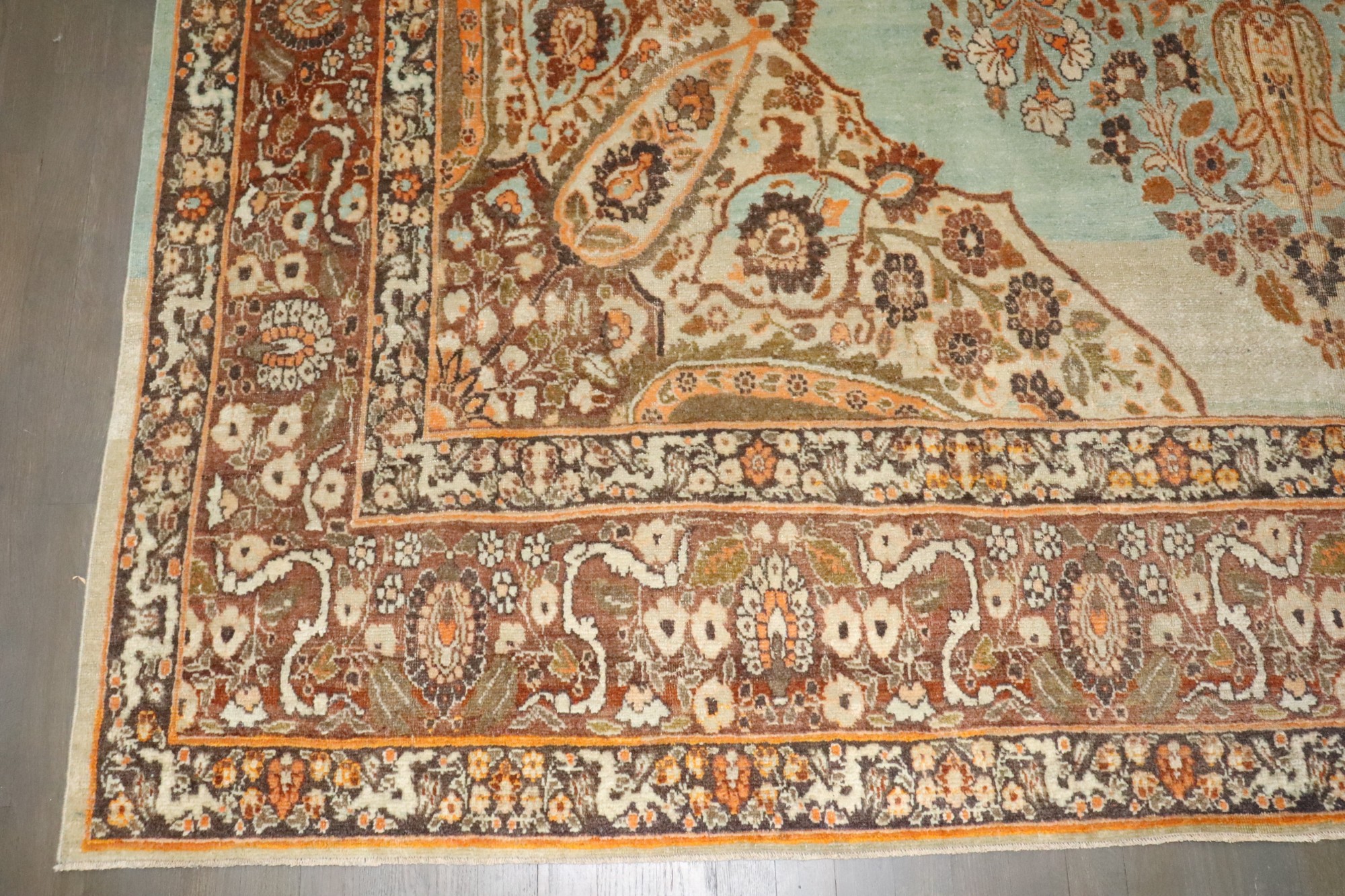 stunning small room size Persian tabriz rug in pretty turquoise and orange tones