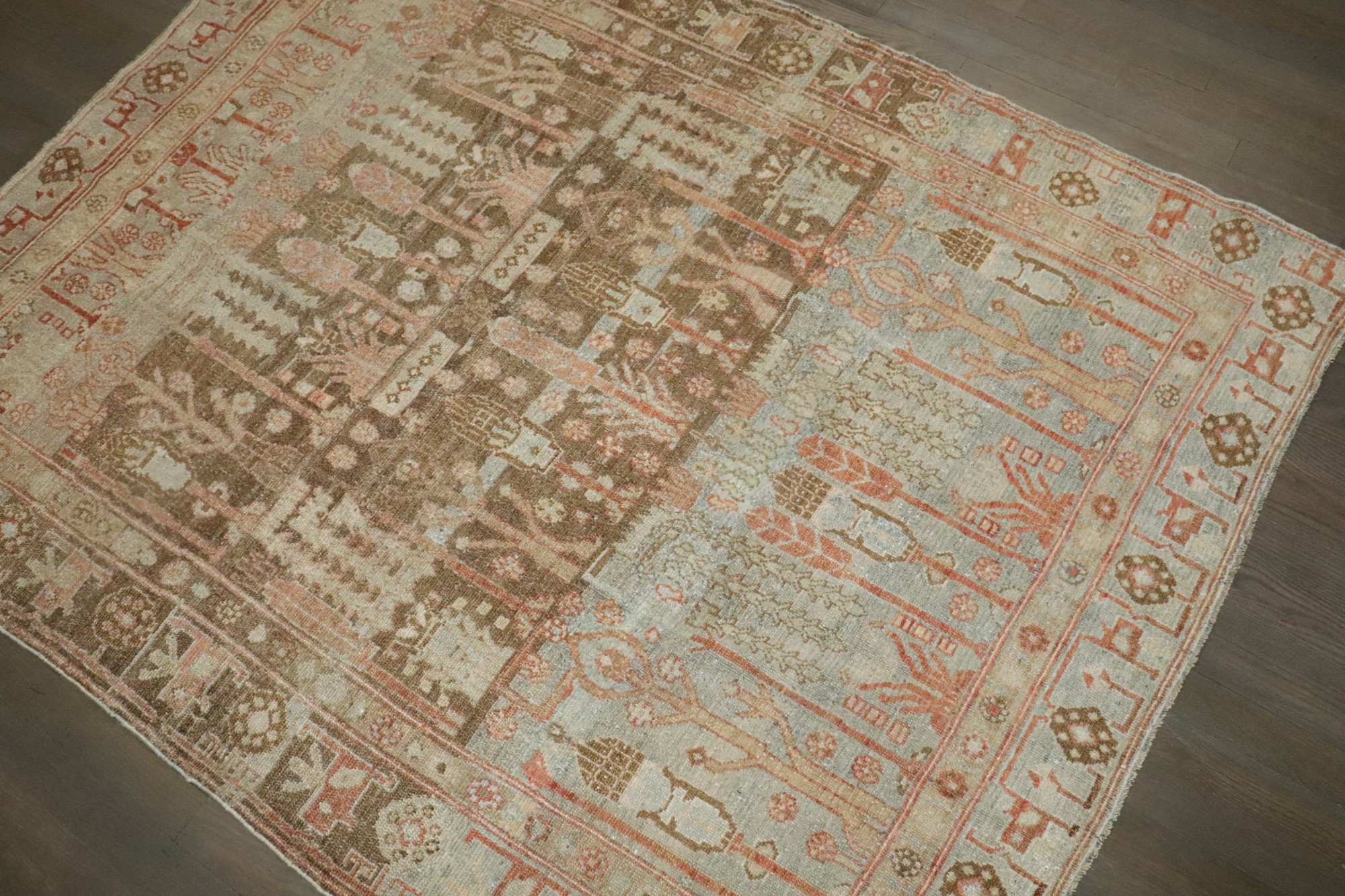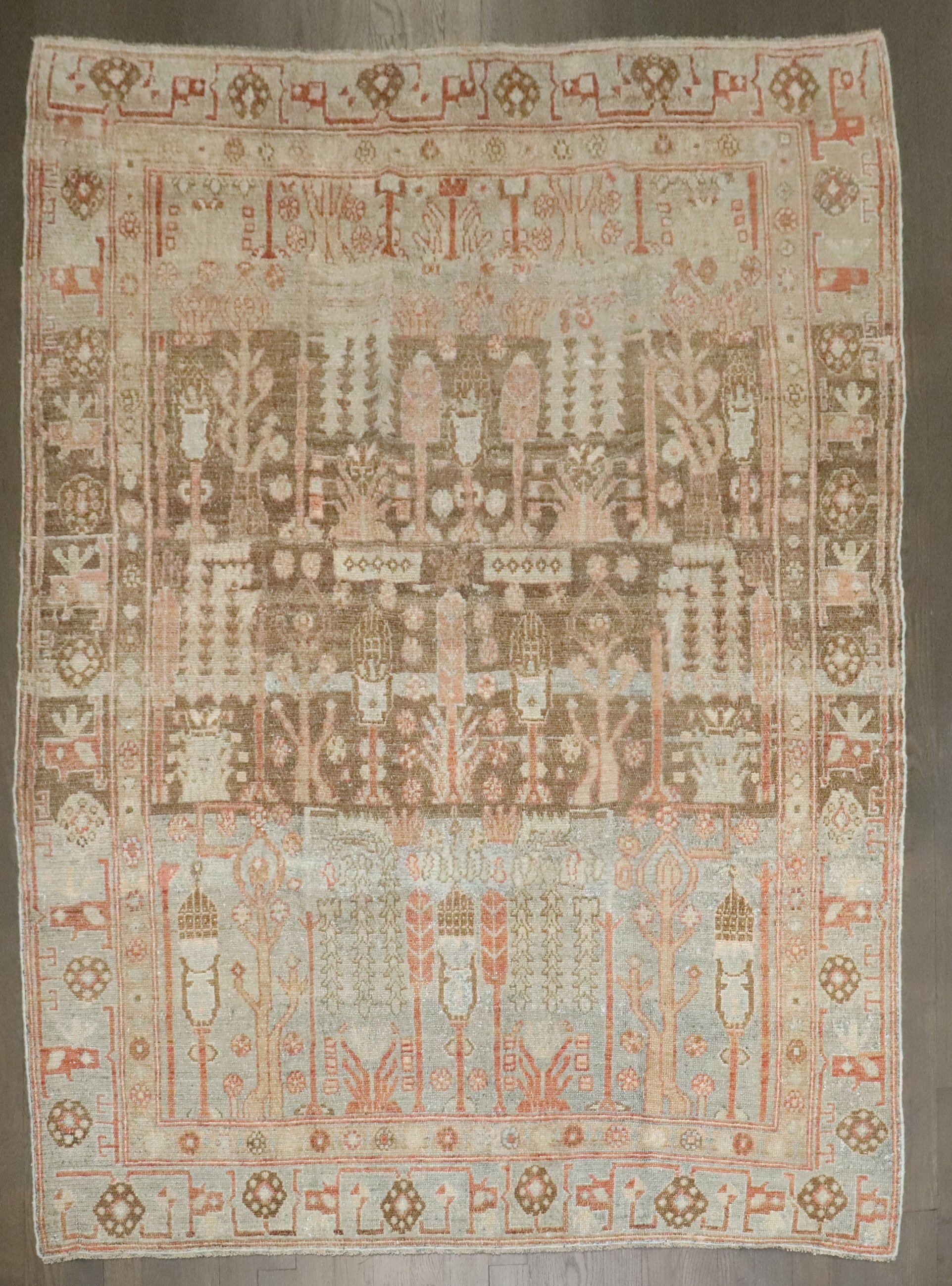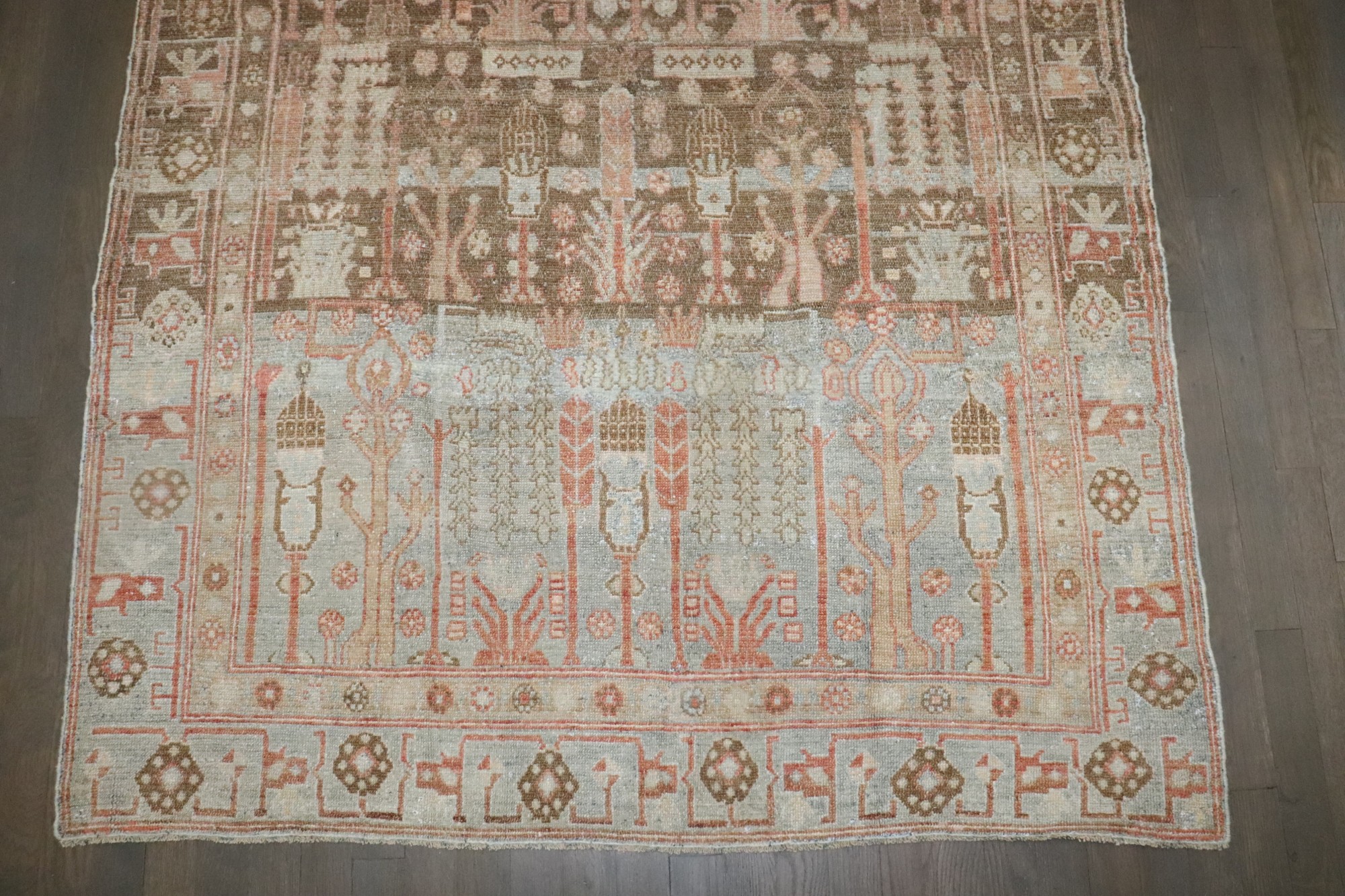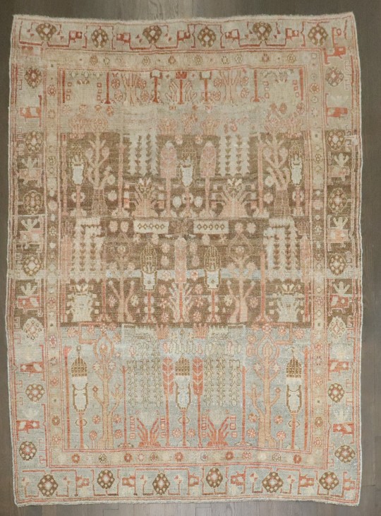 an accent size persian Malayer rug from the 2nd quarter of the 20th century with a tree of life pattern on a striated brown and blue field
