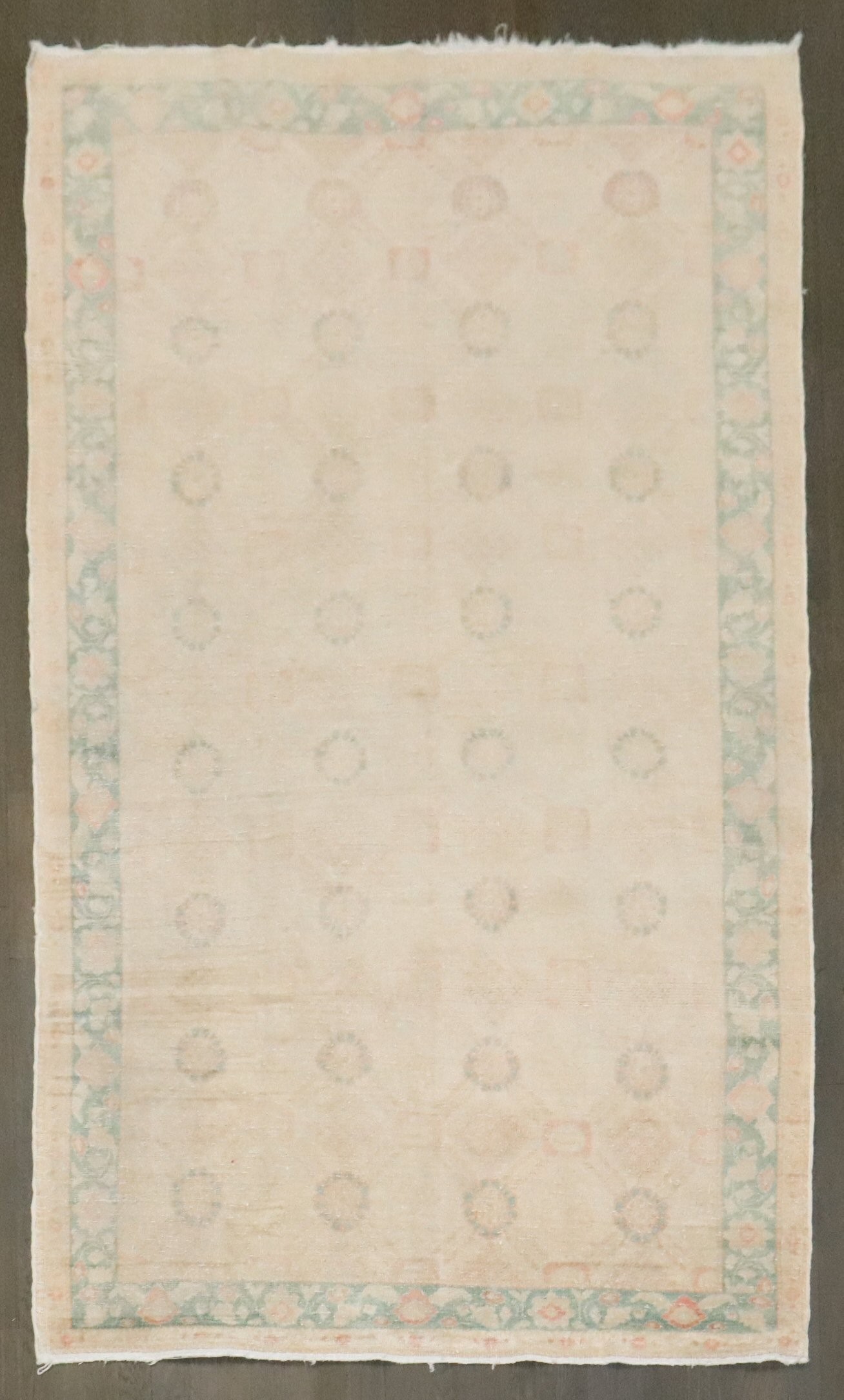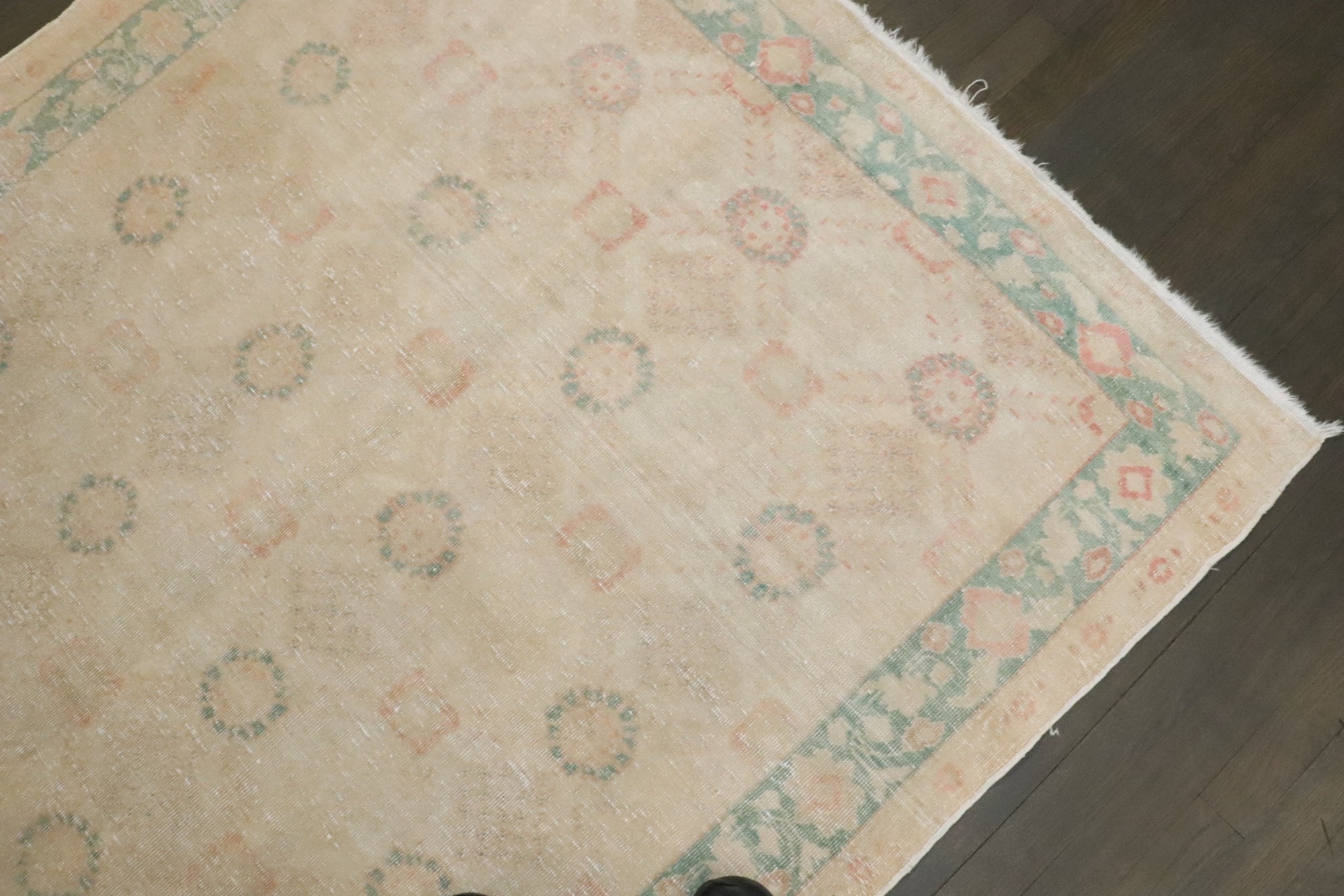 a mid 20th Century Persian Hamedan Rug thats been whitewashed. accent colors in green and pink